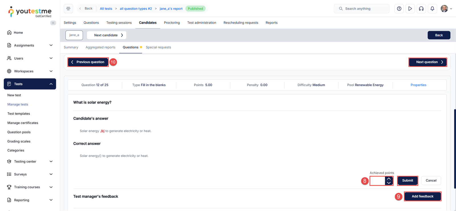 Follow the same grading steps described previously to evaluate the questions in the selected attempt. Use the Previous Candidate and Next Candidate buttons to navigate between personal reports, or click the Back button to return to the list of candidate attempts.