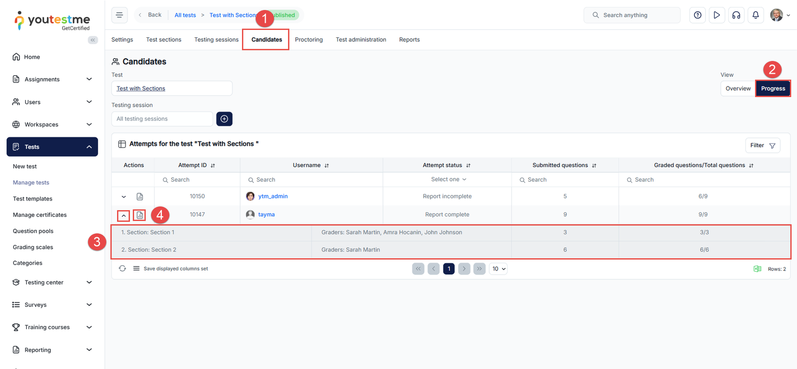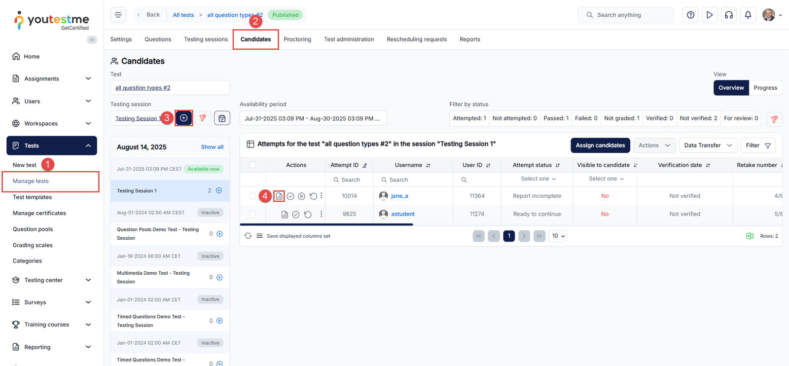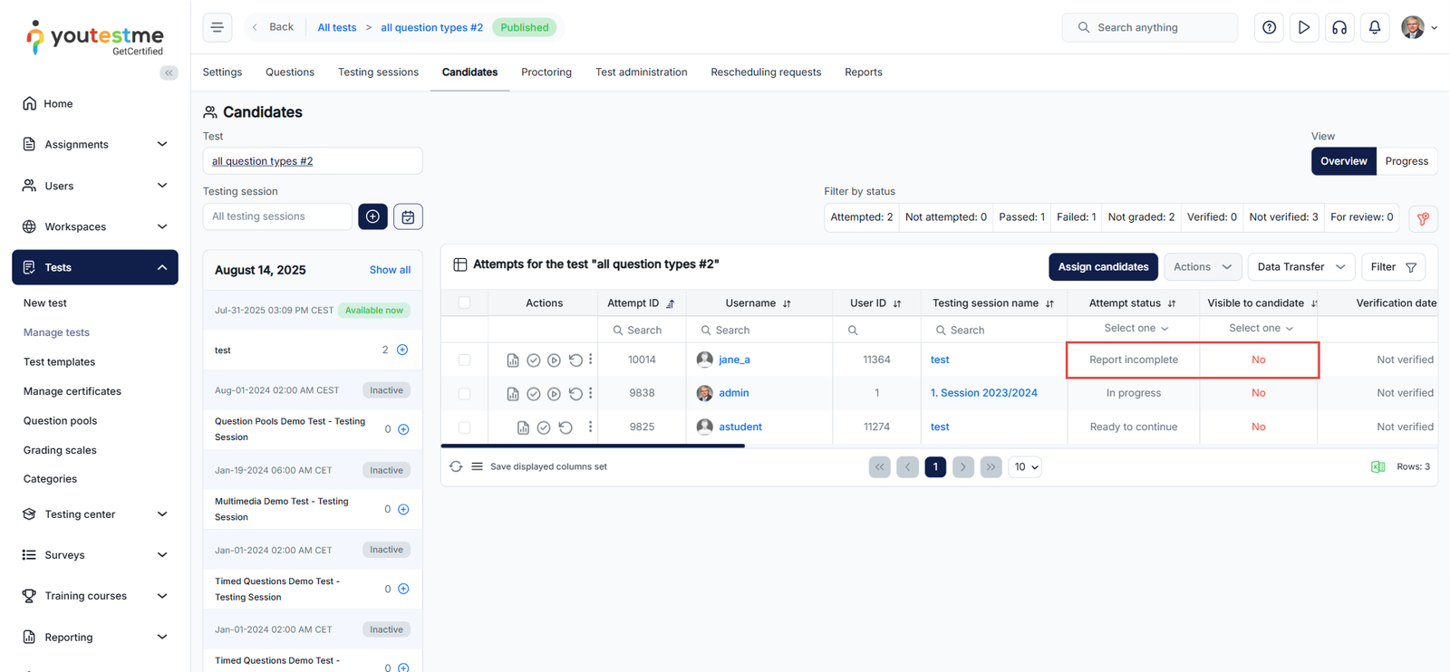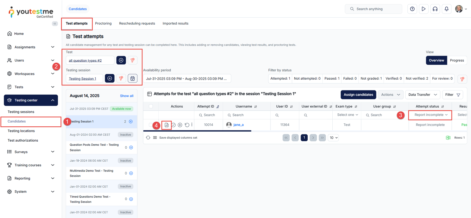 - In the Test Attempts tab, use the Test and Testing Session filters to narrow down attempts based on the specific test and session during which the candidates took the exam.