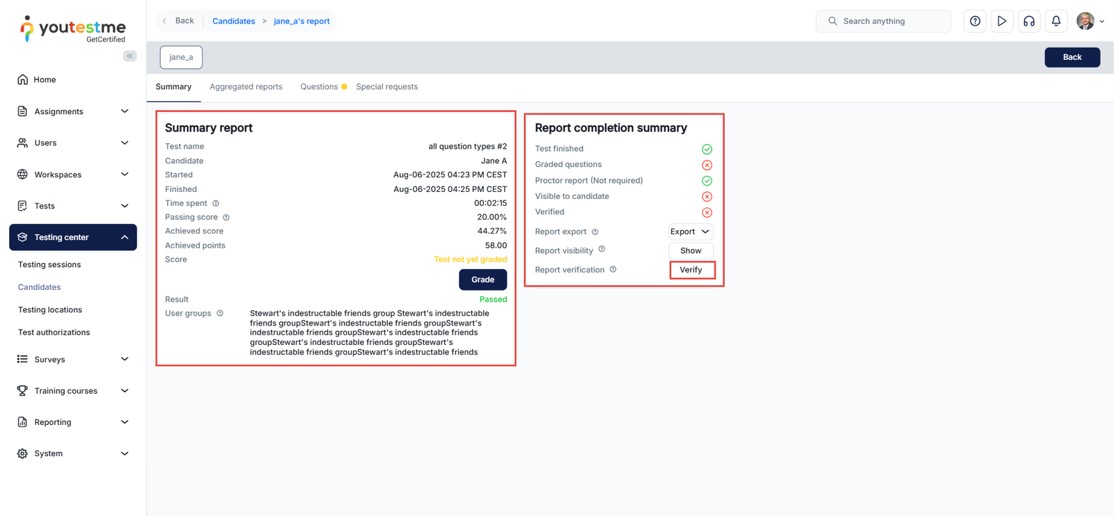 If the results require verification, the grader or an authorized user should go to the Summary tab of the personal report and click the “Verify” button to make the results visible to the candidate.