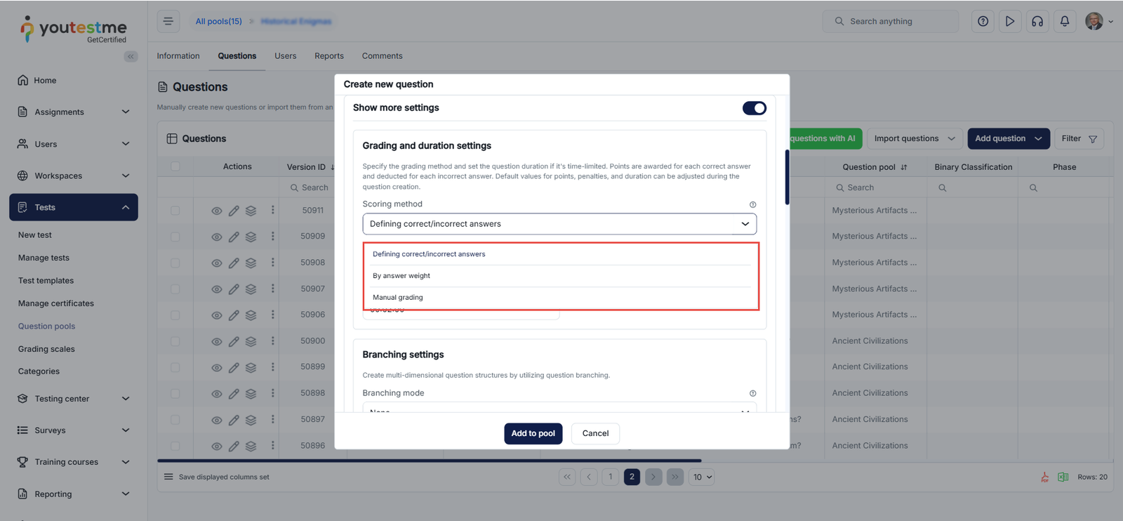 The YouTestMe application offers various scoring options for different question types, including manual grading. For more information, please refer to the related article on question scoring methods.