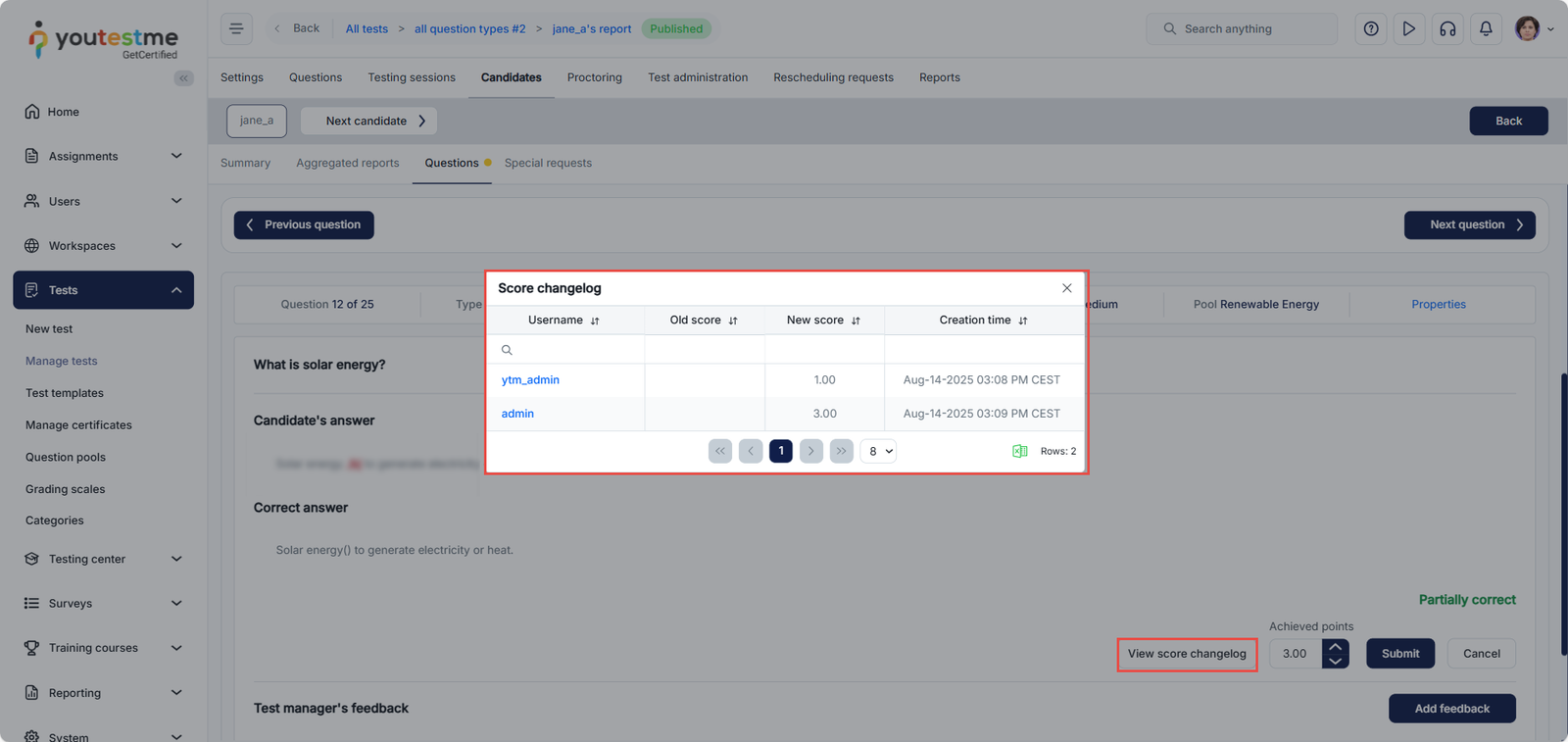 To ensure transparency and accountability in grading, YouTestMe provides a Score Changelog feature that records every score modification made during the evaluation process.