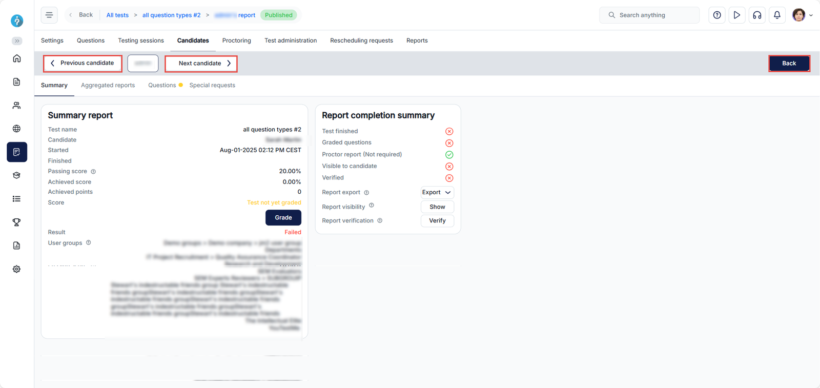 After the candidate completes the test, its status will be marked as “Report Incomplete”. A grader or any authorized user must follow the steps outlined below to evaluate and complete the grading of the candidate’s attempt.