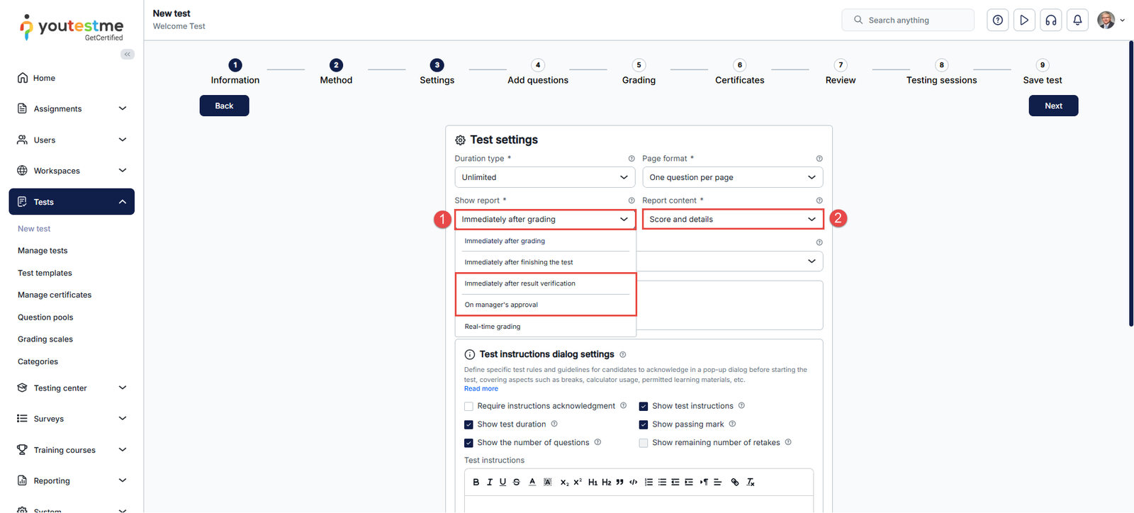 At YouTestMe, you can control when test-takers see their results, what information is shown, and how long it’s available.