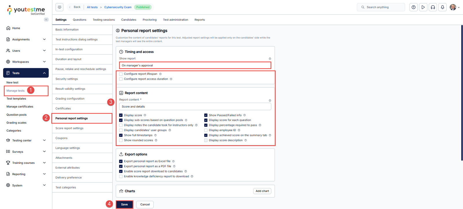 - Under the Settings tab, click on Personal Report Settings. Here, you can choose when candidates should see their results. To restrict access until it has been approved by the test managers. Choose one of the following options: