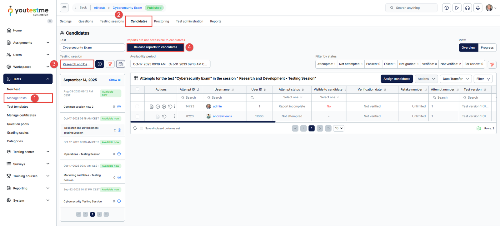 When the Immediately After Result Verification option is selected, the test administrator or any permitted user should verify the exam attempts to allow test-takers access to their personal report.