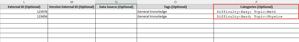 In the Categories (Optional) column, enter the values by writing the category name followed by a colon and its value. If you want to add multiple categories, separate them with a semicolon. For example: