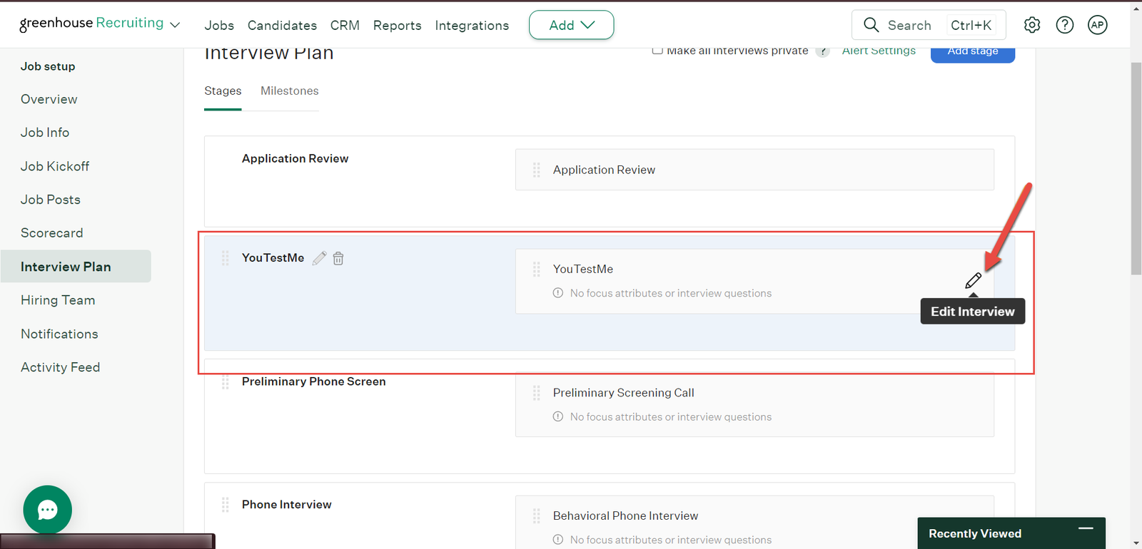 Once the YouTestMe stage is added, edit the interview by selecting the edit option.
