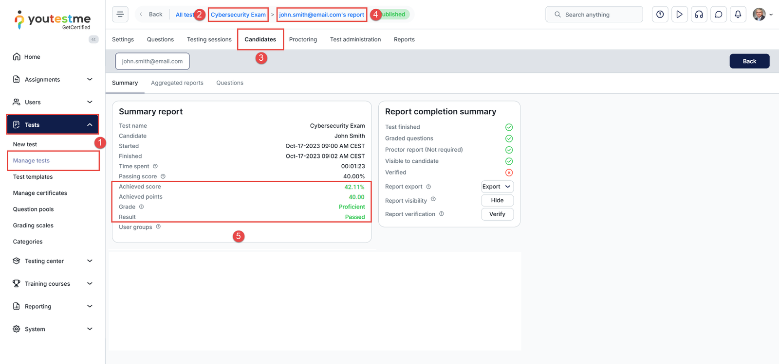 The candidate will receive an email stating that the results are available and accessible by logging in to YouTestMe GetCertified.