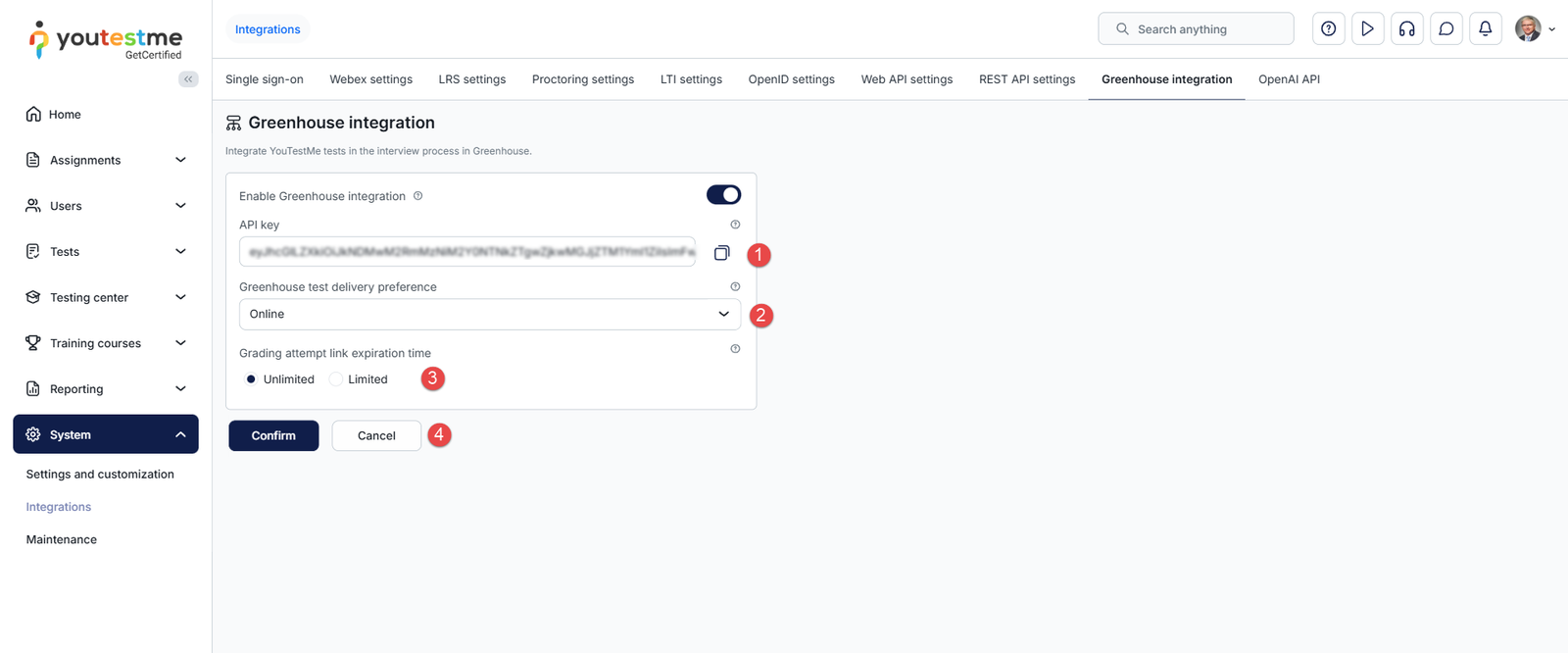 1. The API key is generated and displayed. Provide this key to the Greenhouse team so they can set up the YouTestMe integration. For more information about setting up the integration on the Greenhouse side, visit the following link.