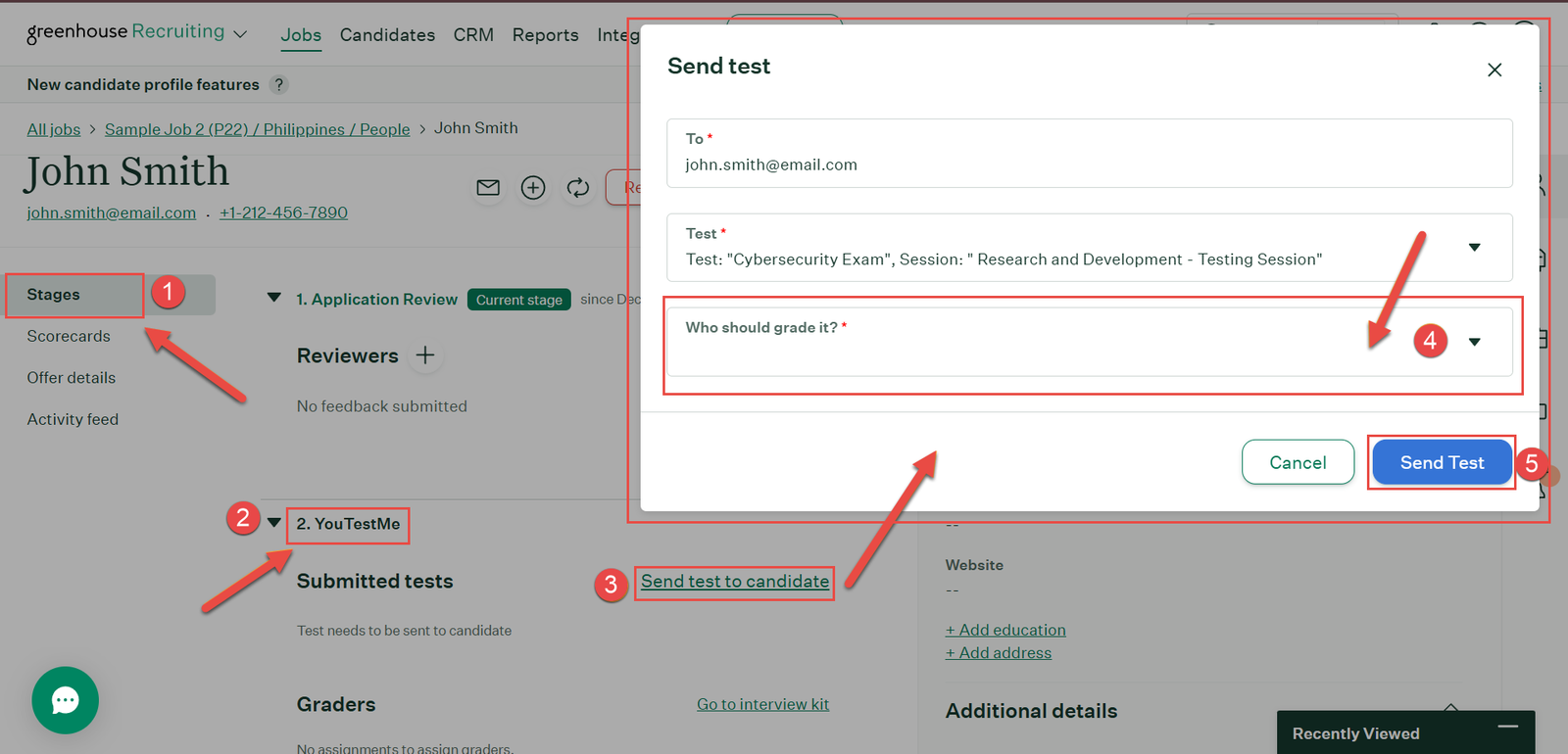 1. -3. Send the test to the candidate by navigating to the YouTestMe tab in ‘Stages‘ and selecting ‘Send Test to Candidate.’