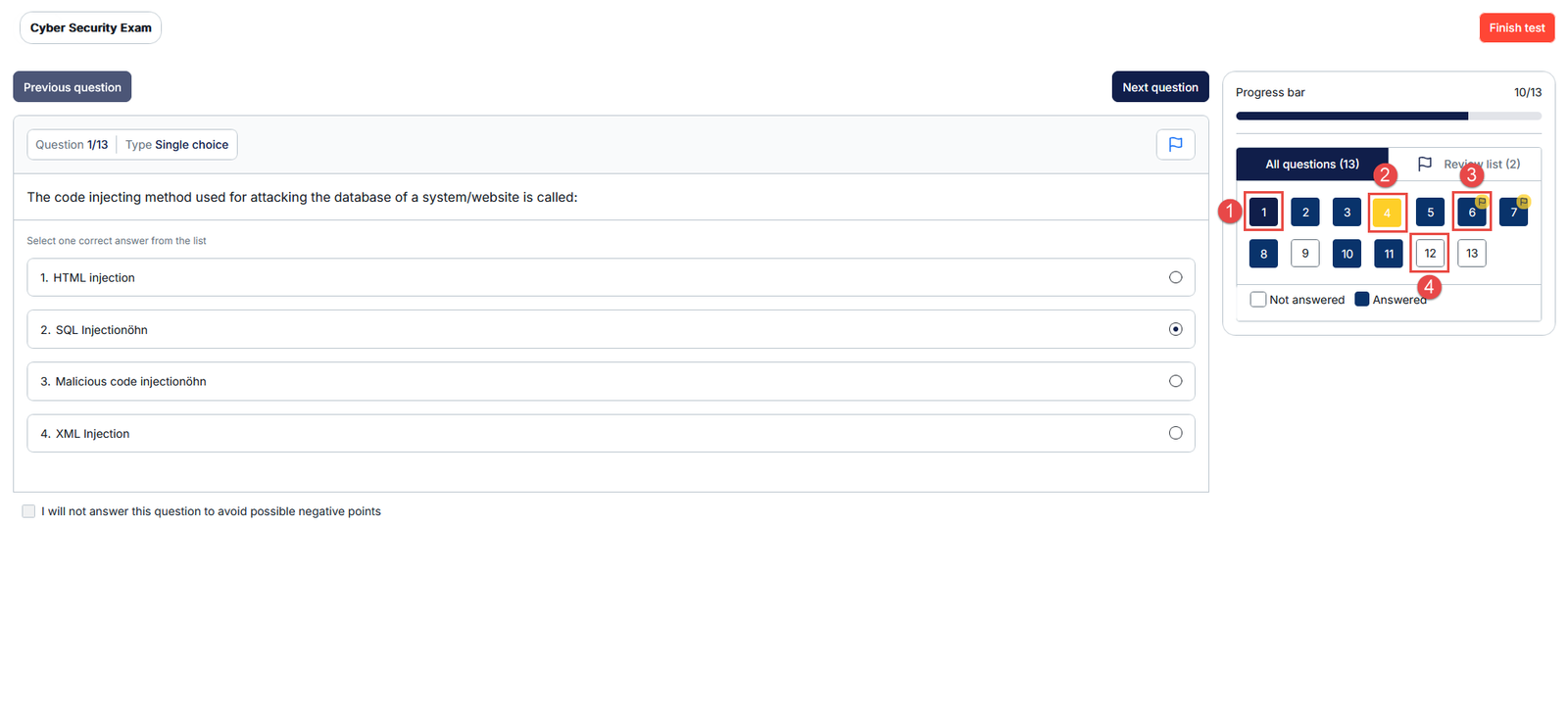 Questions marked as “I will not answer this question to avoid negative points” (yellow)