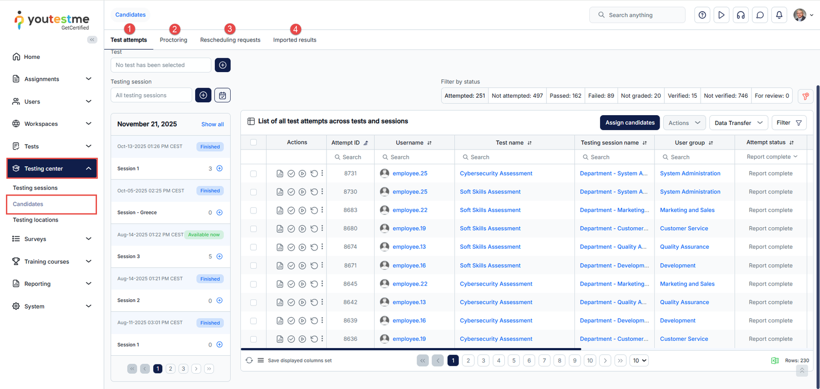 This article outlines how to oversee and review all test attempts from a single, streamlined page within the Candidates tab. From this central location, you can perform every aspect of candidate management for any test or testing session, including adding or removing participants, accessing test results, and proctoring exams.