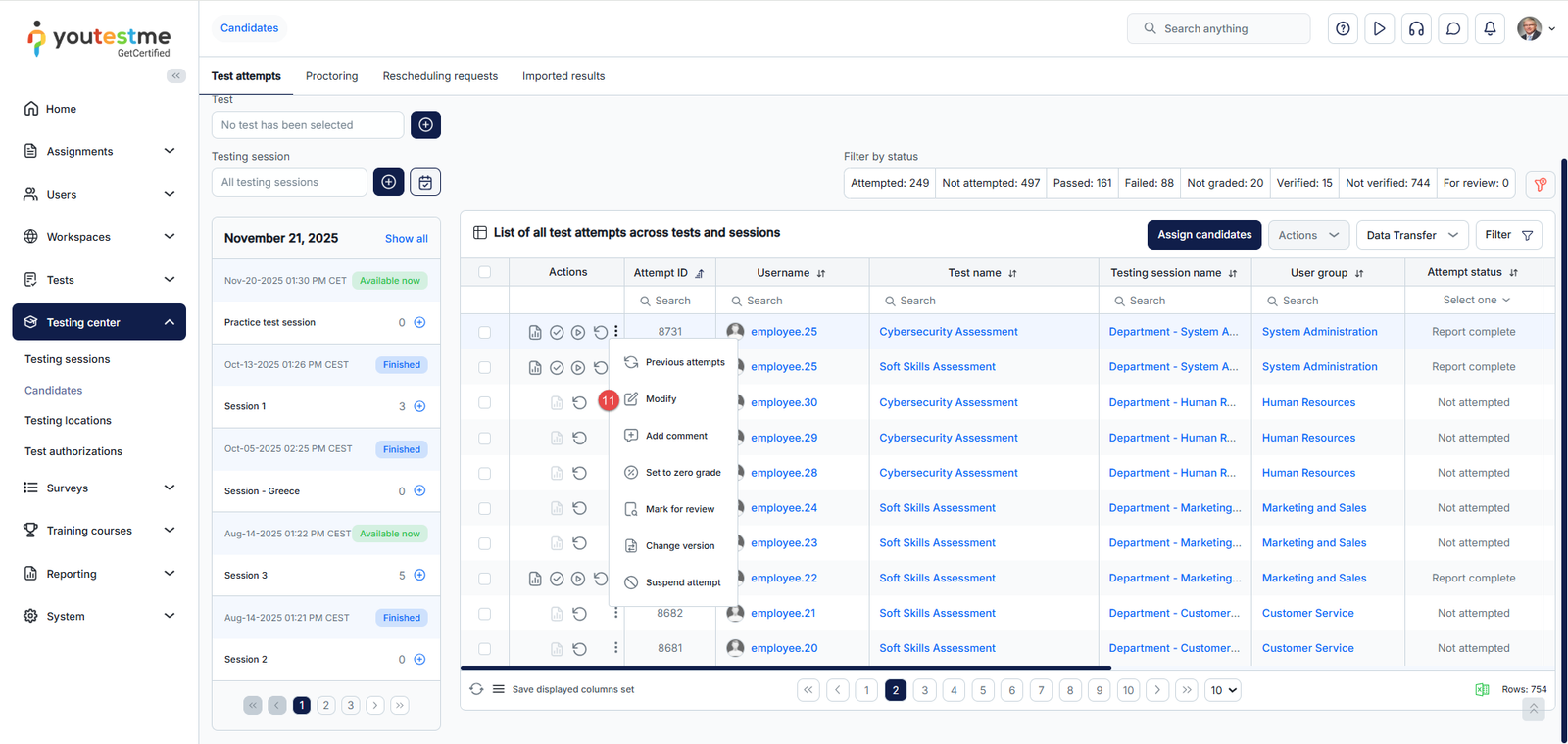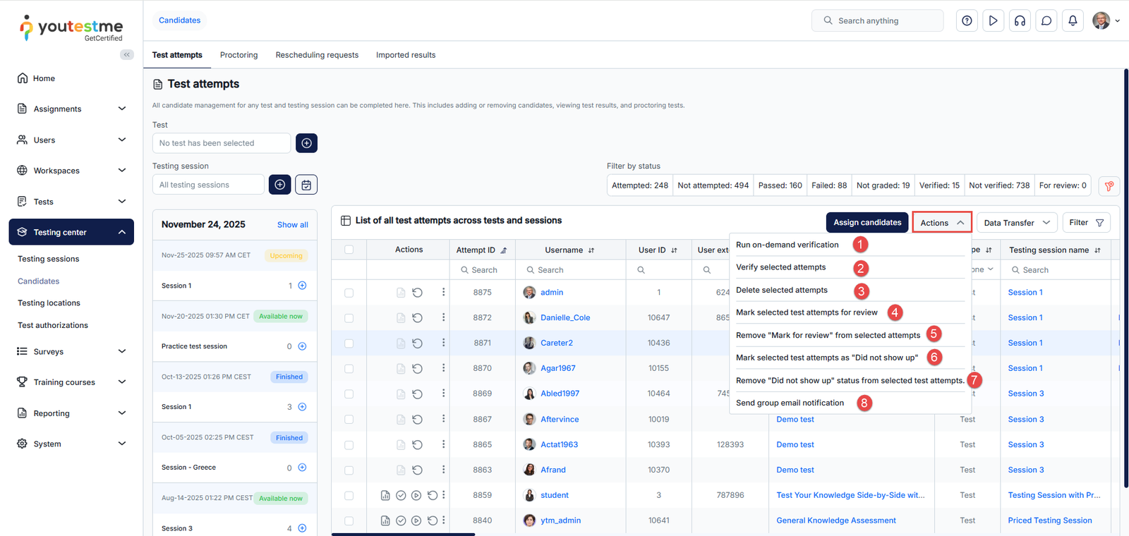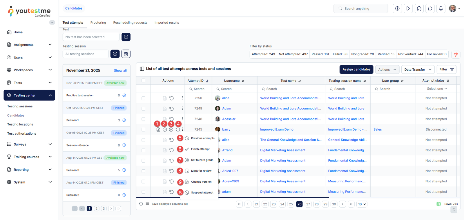 - Test attempts – Assign candidates to testing sessions or remove those already assigned, view their test attempts and grade them accordingly.