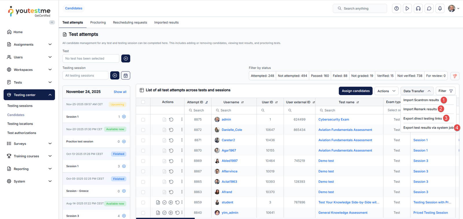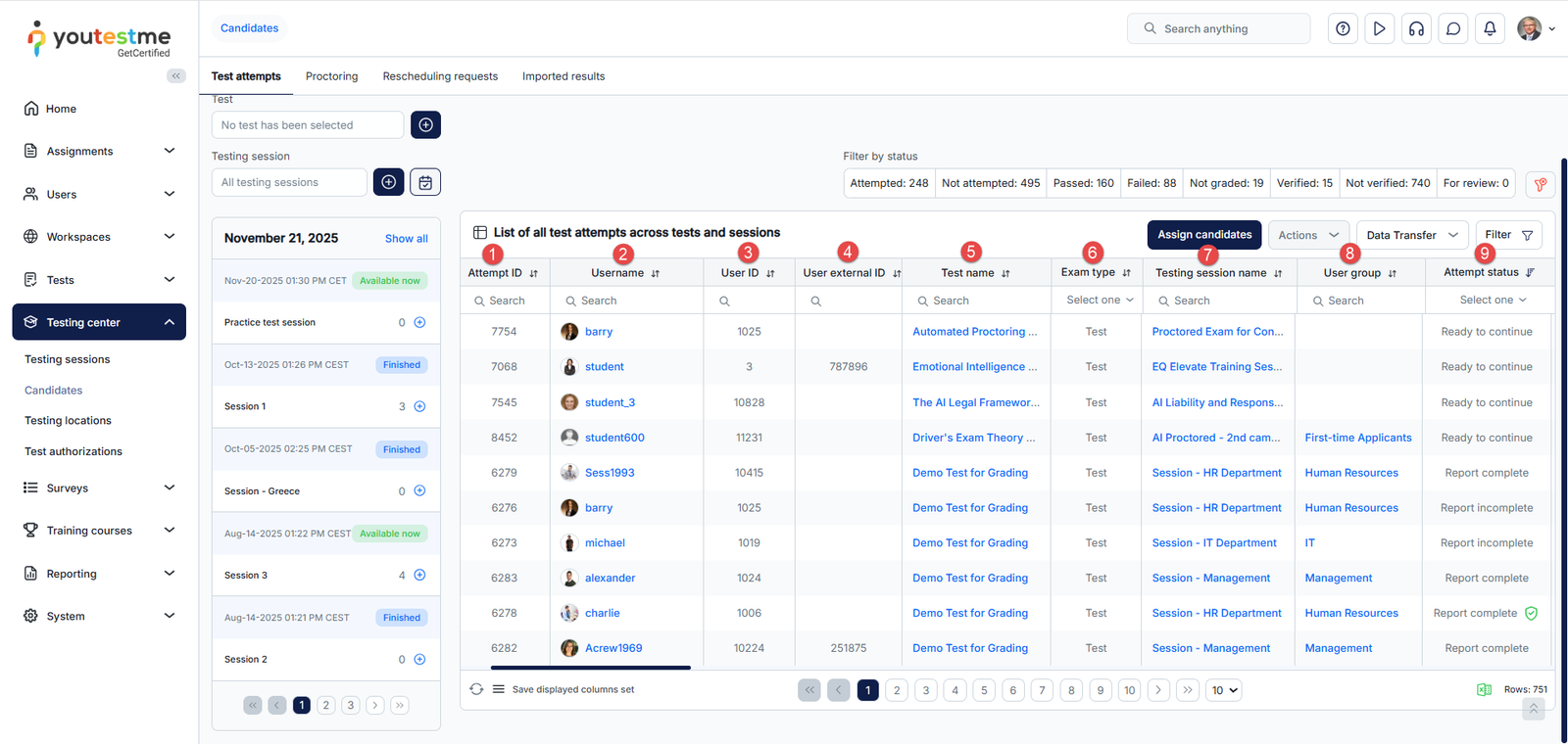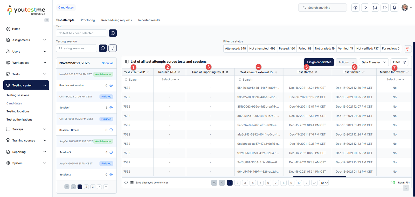 - Test attempts – Assign candidates to testing sessions or remove those already assigned, view their test attempts and grade them accordingly.
