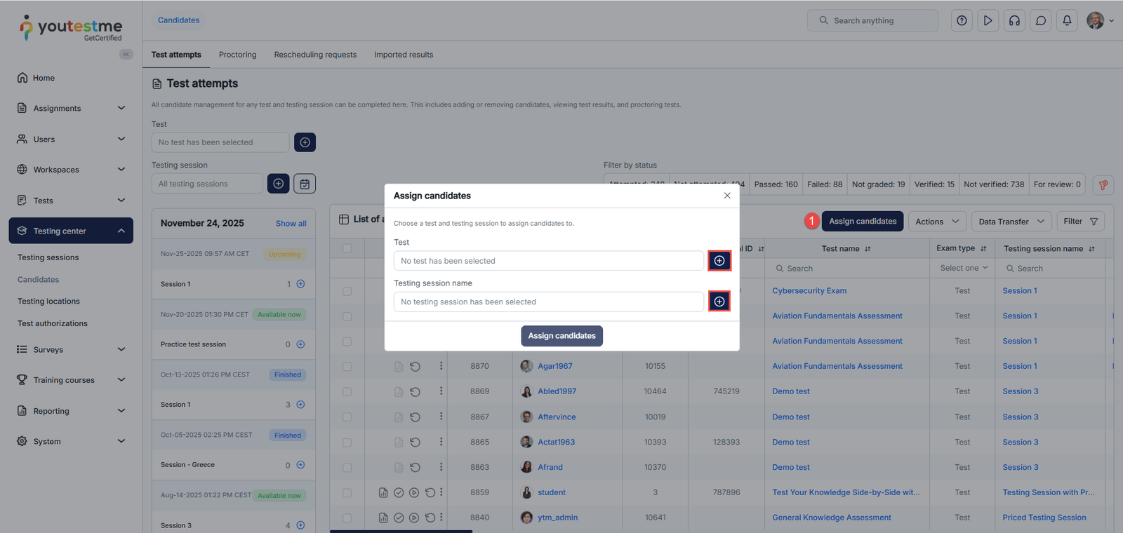 - Assign candidates to the selected test scheduled in the chosen testing session.