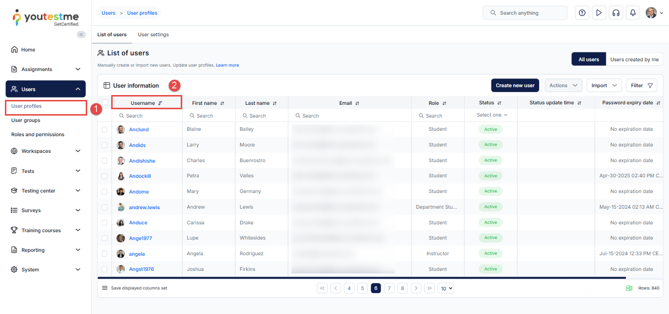 - In the main menu, select Users and then choose User profiles. The list of all users in the system will be displayed.