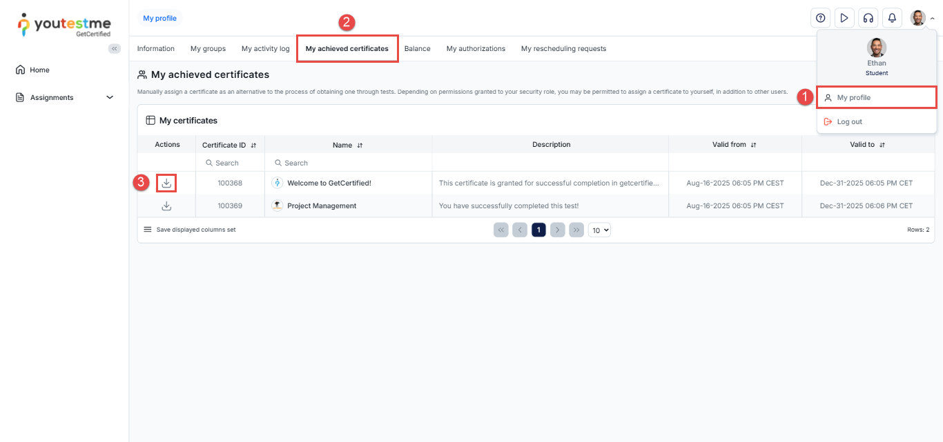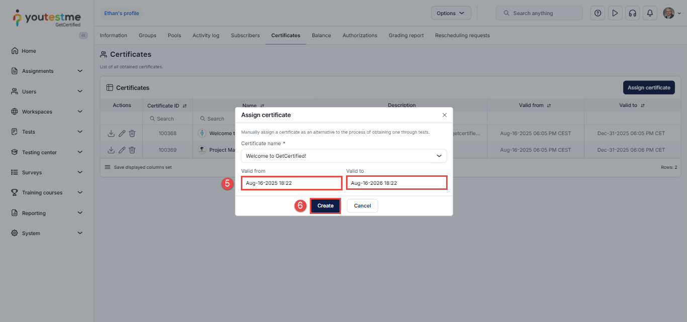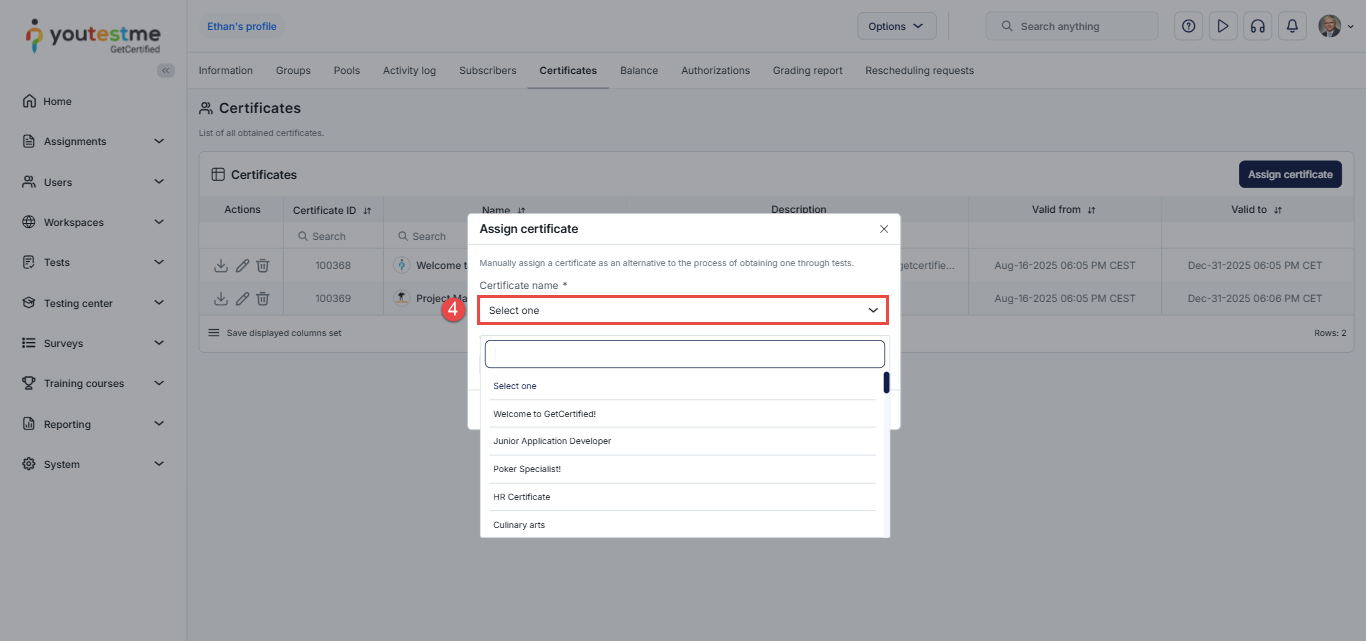 Note: If the certificate template automatically includes the test name, manually assigning a certificate will not add the test name. To avoid this, use a template that either already includes the test name or does not have a test name field.