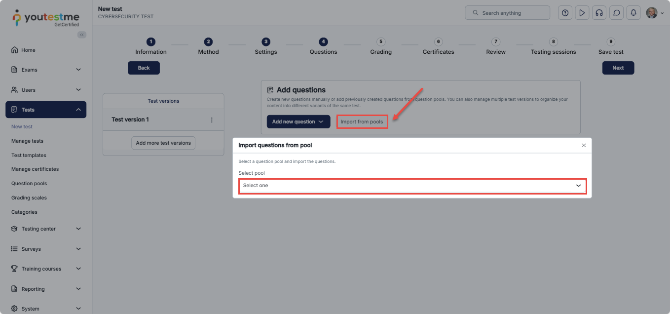 On the next step, click the Import from pools button to select your desired question pool.