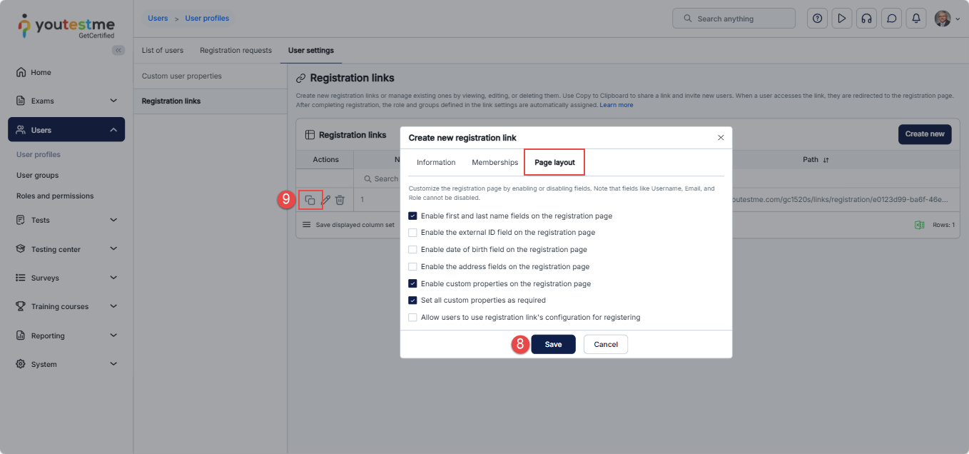 You can check the boxes to customize the registration page by enabling or disabling fields. Note that fields like Username, Email, and Role cannot be disabled. - Click on the Save button to create a registration link.