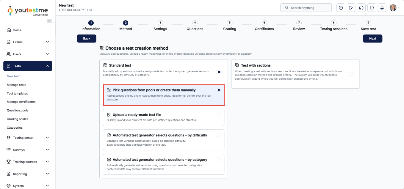 You can start creating a test as shown in the following article, with the note that, when adding questions, you should select Pick questions from pools.