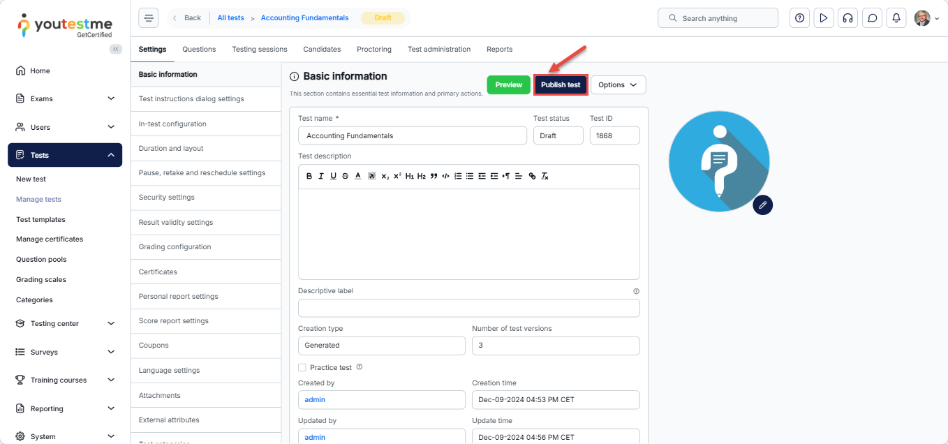 After the test and sessions are ready, Publish the test.