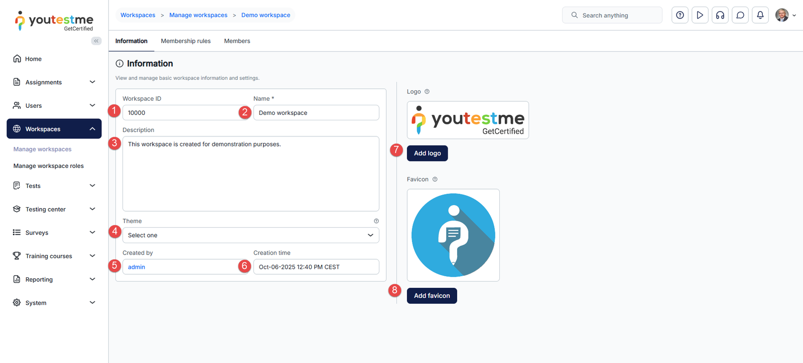 Training courses, surveys, and tests can be added to different workspaces. These entities are visible and accessible only to the managers and members of the chosen workspace. To add a workspace to the desired training course, survey, or test, select it from the Workspace section in the Information tab of the desired entity.