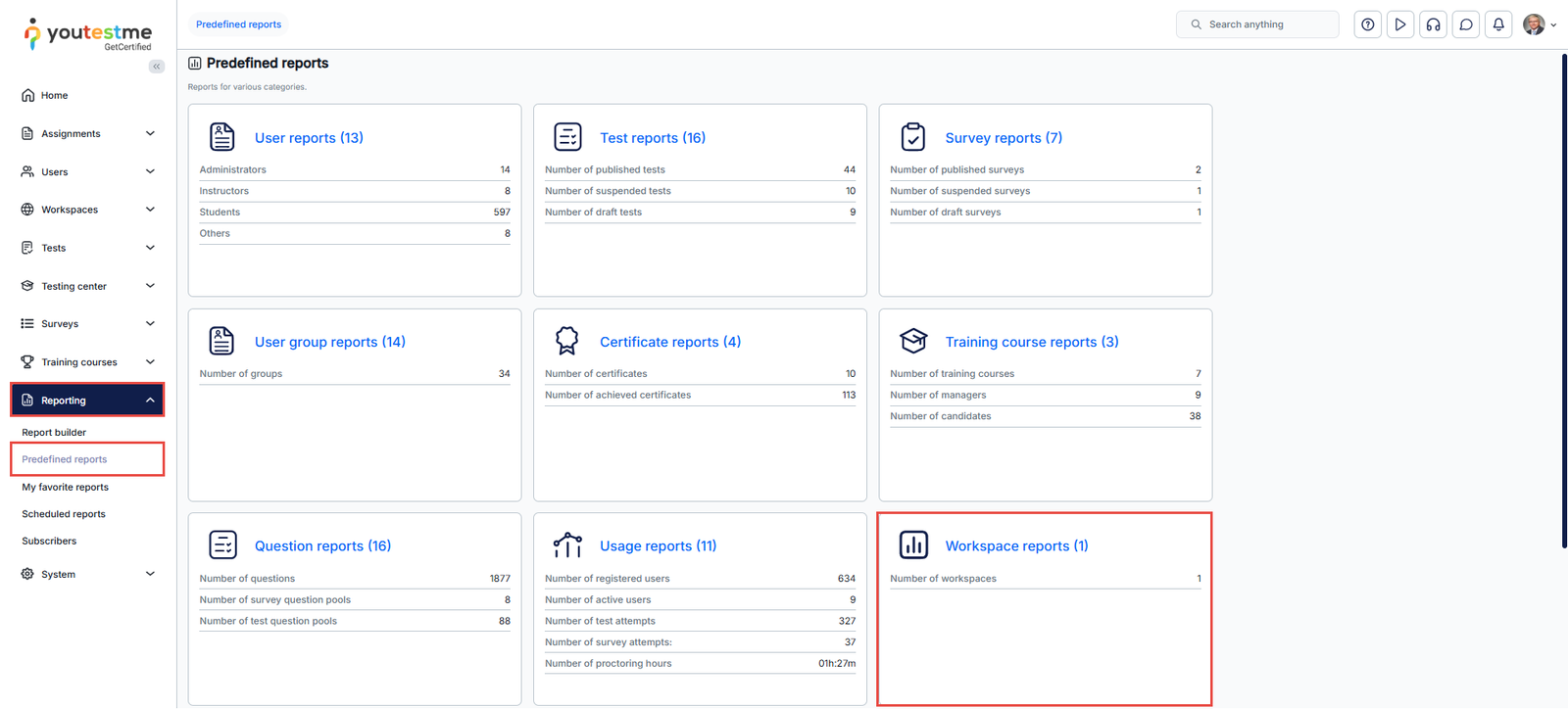- The number of tests, surveys, training courses, user groups, question categories, and test pools within each workspace.