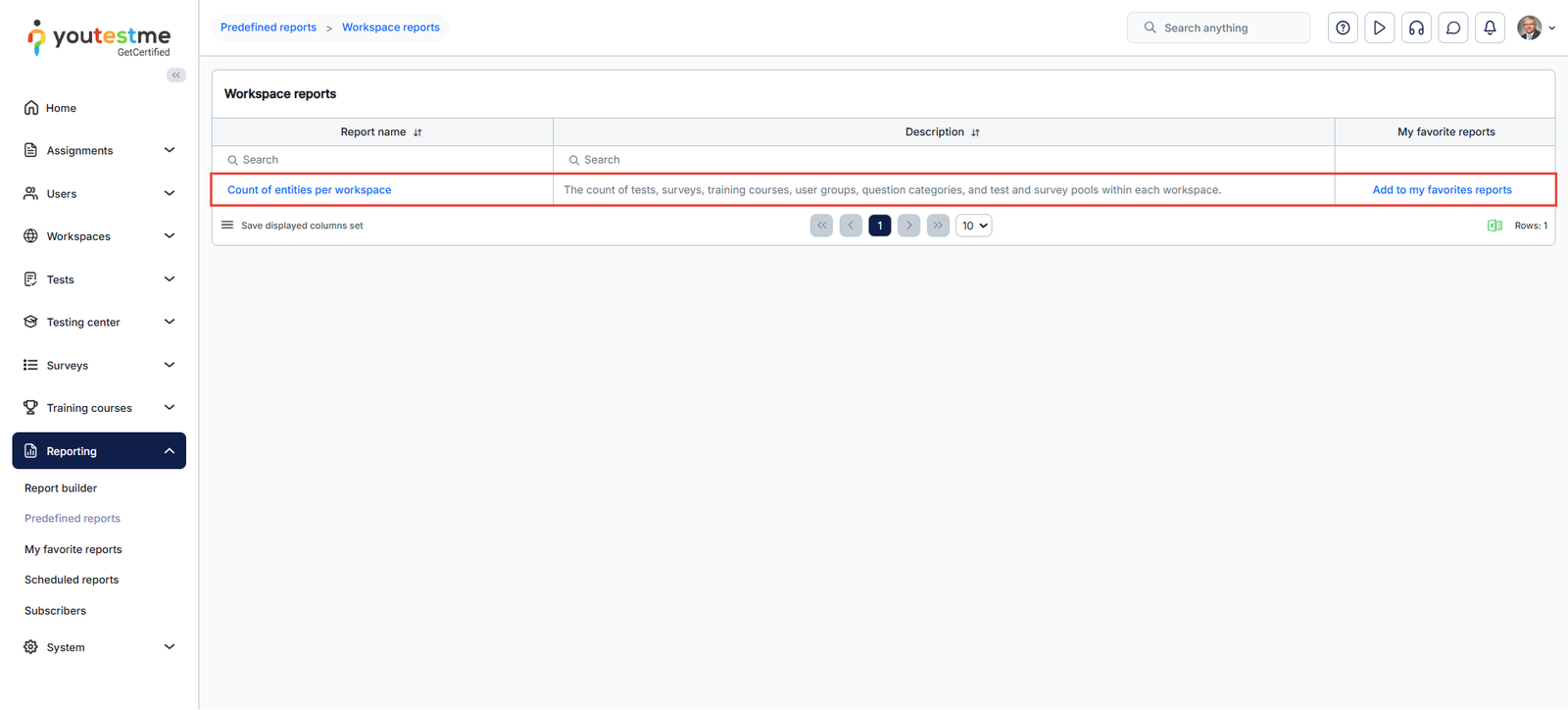 To access this report, navigate to the Reporting/Predefined reports tab on the left-hand menu and select Workspace reports.