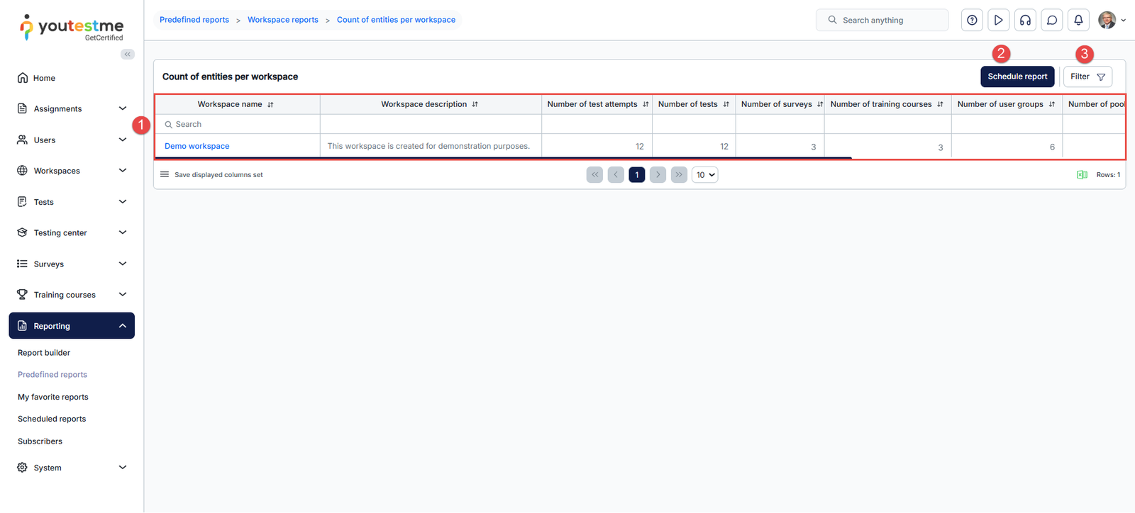 - This report shows each Workspace’s name and description. Additionally, it shows the number of test attempts, tests, surveys, training courses, user group groups, and more.