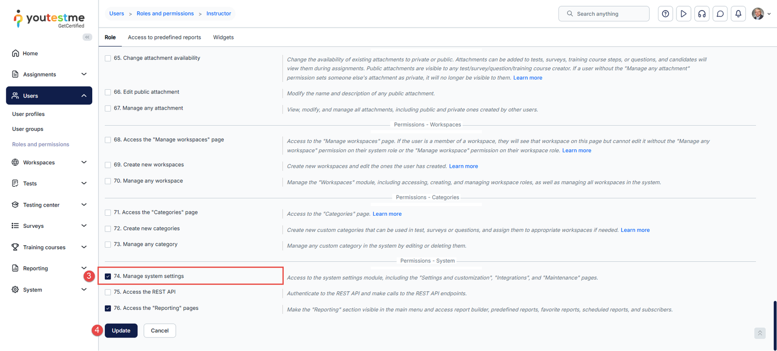 - From the set of permissions, choose the adequate ones. In this case, that is permission number 74. Manage system settings.
