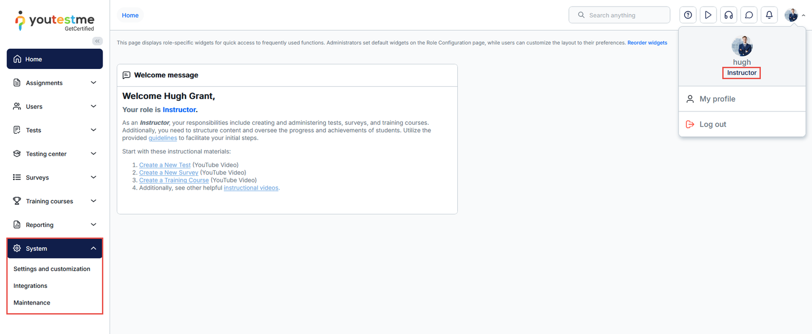 Note: Each user in the system with the Instructor role will have permission to view and manage system settings.