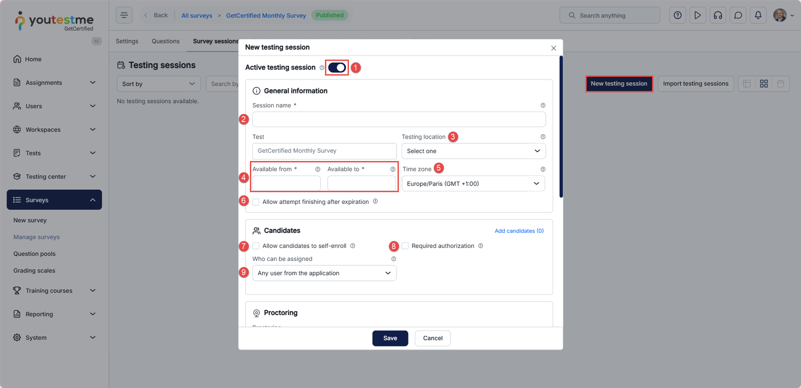 - Time Zone: Set the time zone for the session. The availability period will be automatically converted and displayed to participants based on the time zone defined in their profile settings.