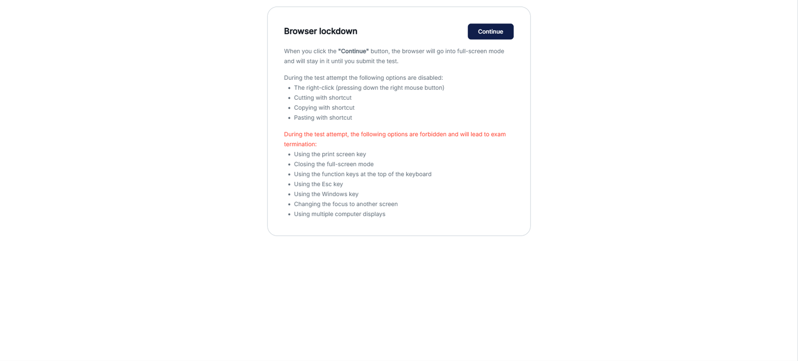 Browser Lockdown helps ensure that candidates remain focused on the test environment by restricting access to unauthorized resources during the test.