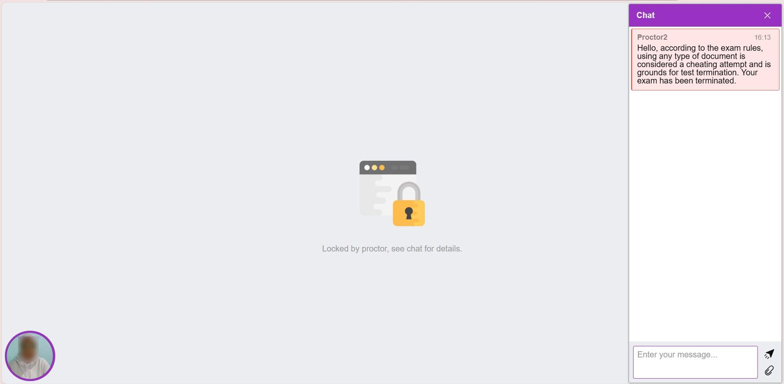 In cases where the proctor detects behavior that violates test rules, such as attempting to access unauthorized resources or ignoring instructions, the proctor may terminate the session. This action is taken to protect the integrity of the assessment process.