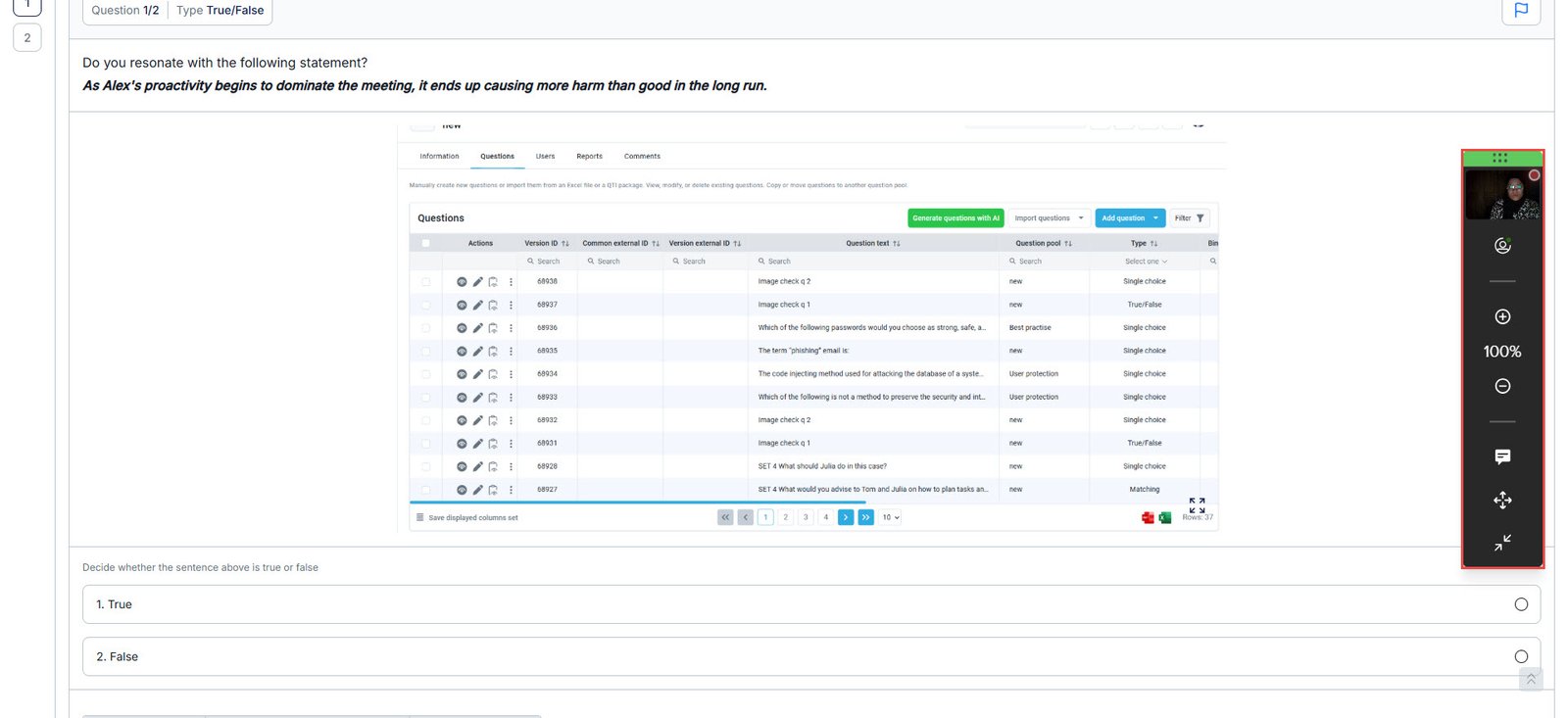 During the test, the system warns candidates if, for example, they open another tab. In addition to the system metrics, with live proctoring, the proctor records their observations about the candidate’s behavior.