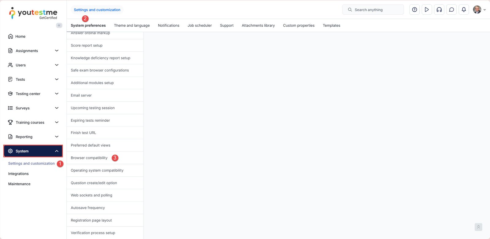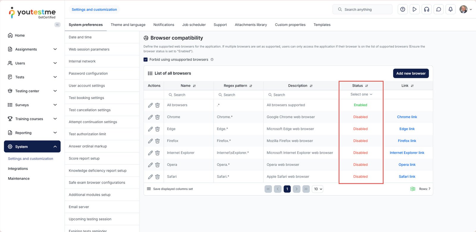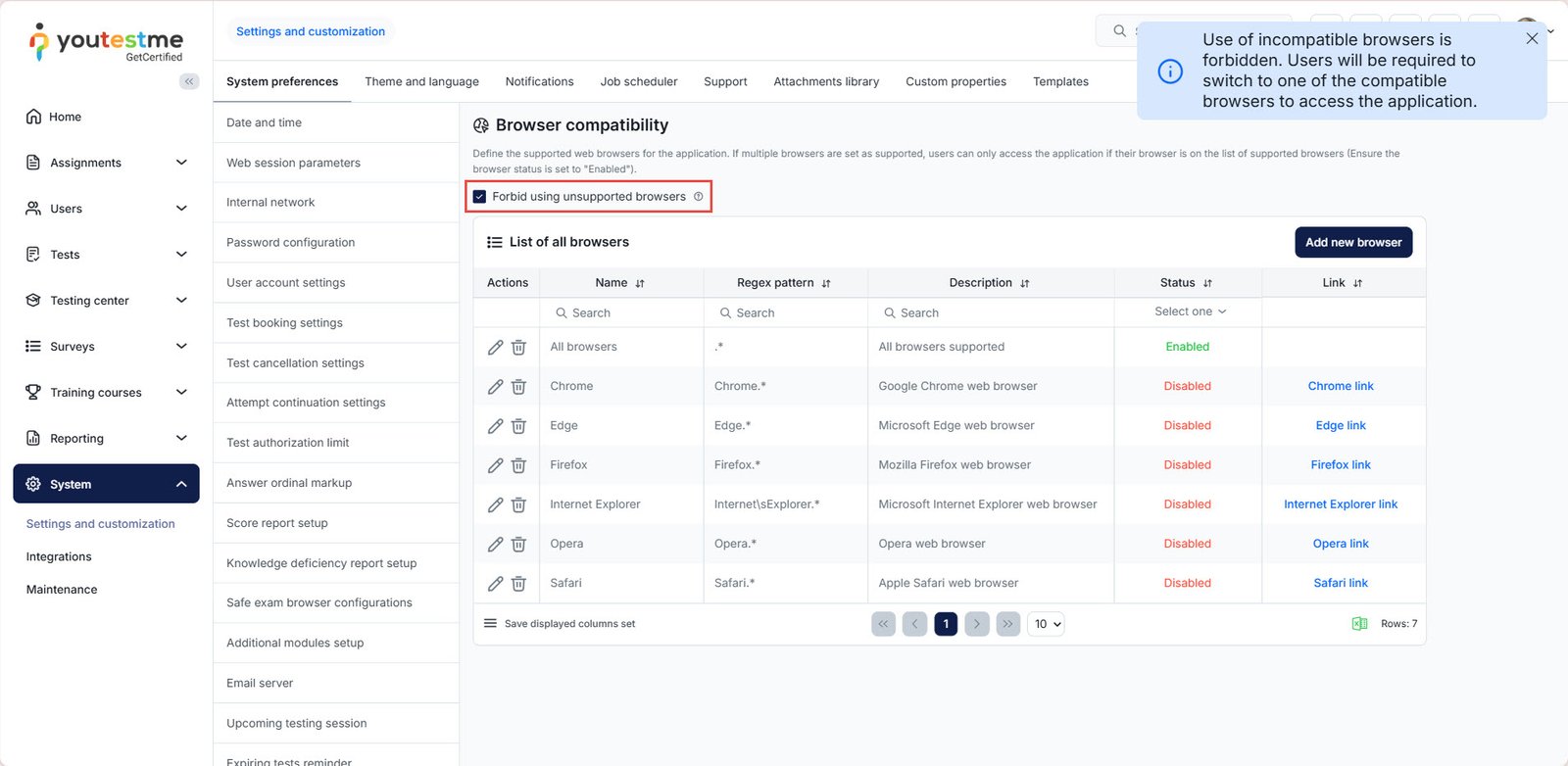 To implement the browser check to be executed when tests are initiated, enable the Forbid using unsupported browsers option. When this option is enabled, the application prevents users from accessing it with incompatible browsers. Otherwise, users will only be warned but will be granted access.