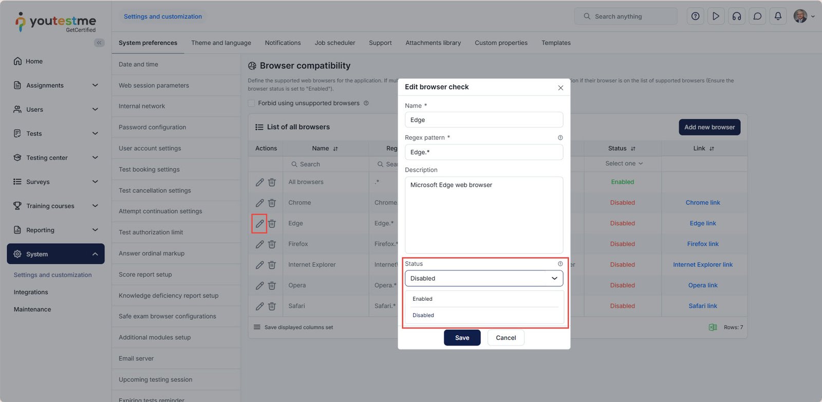 To change the status of a browser check, select the Edit icon from the Actions button for the desired browser, then choose the desired status.