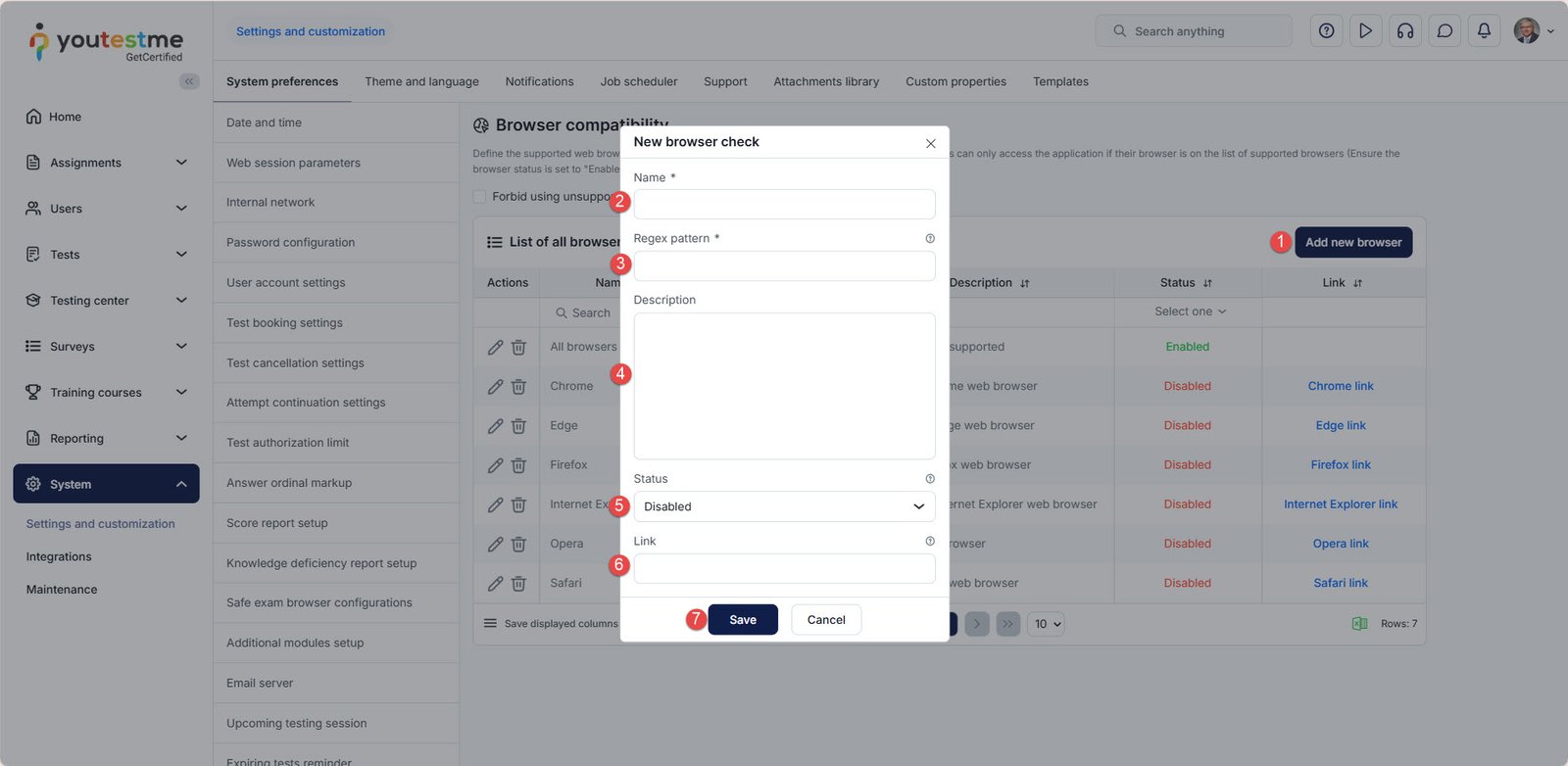 - Enter its Regex pattern to be used for this browser check. If the user’s browser matches this regex pattern, this browser check contributes to whether the browser is considered supported or unsupported by the system.