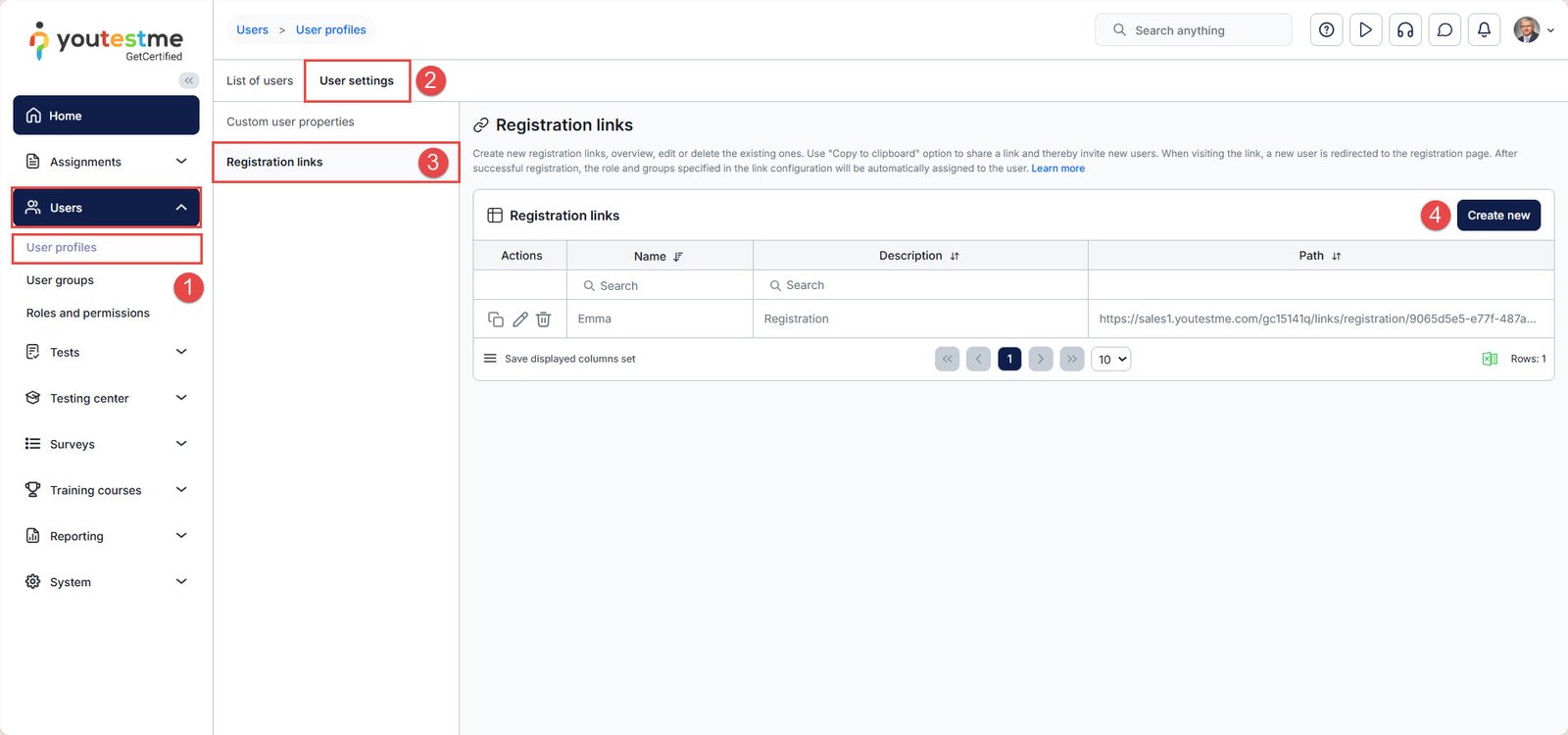 Open the desired link from the User Settings tab in User Profiles and access to Registration links.