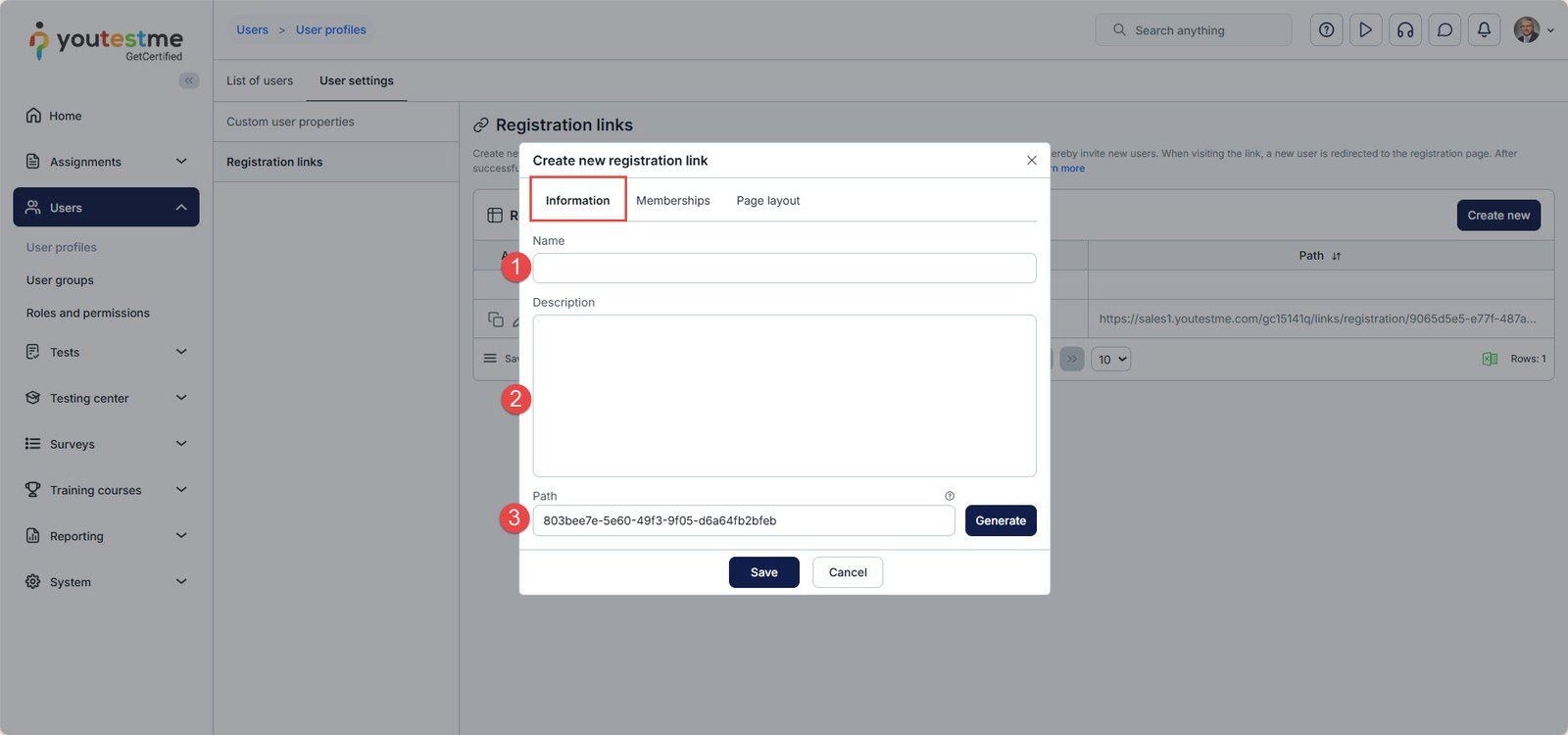 - Insert a random Path to be used as a unique link identifier. It must consist of only letters, numbers, and hyphens. Alternatively, the registration link automatically generates a unique path upon clicking the Generate button.