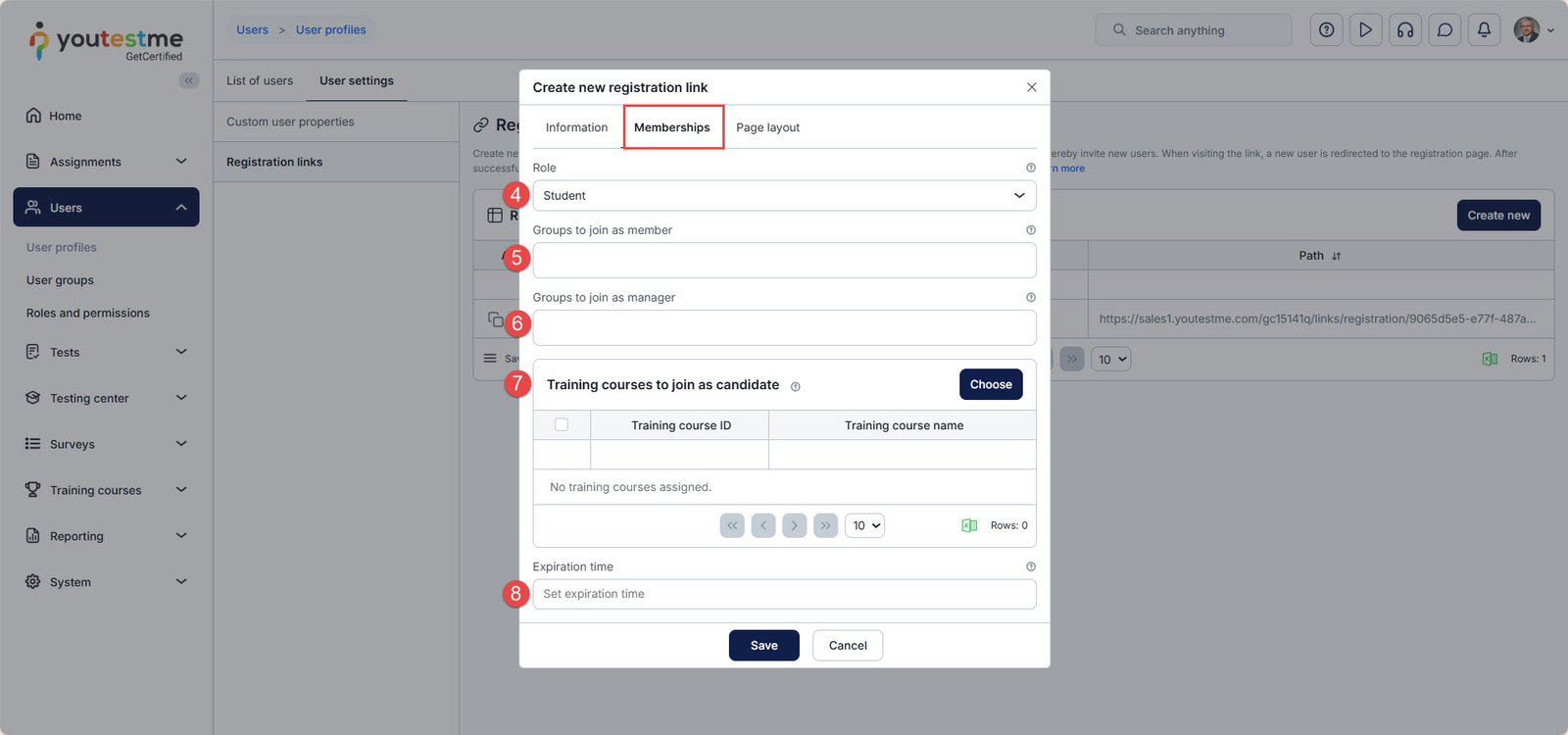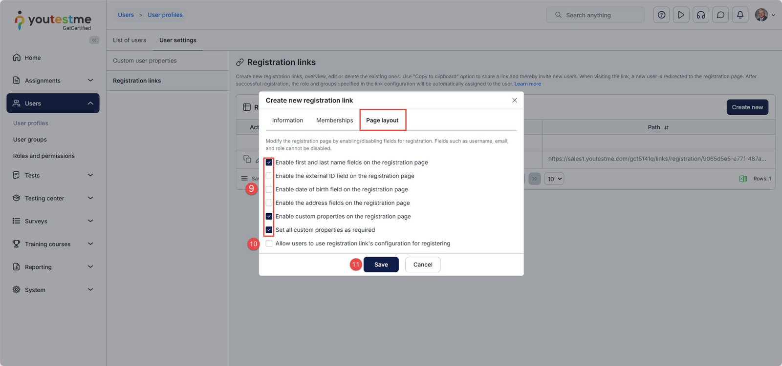 - Configure the displayed registration page fields for users when registering using the link.