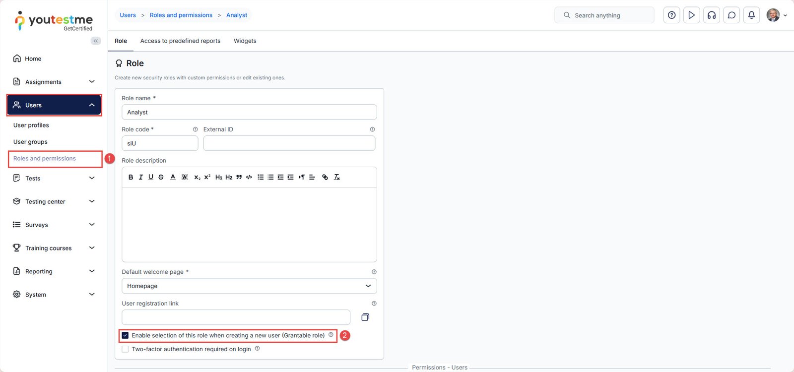 Important: If you wish to prevent users from selecting this role during registration, disable the option. The role will no longer be visible in the drop-down list.