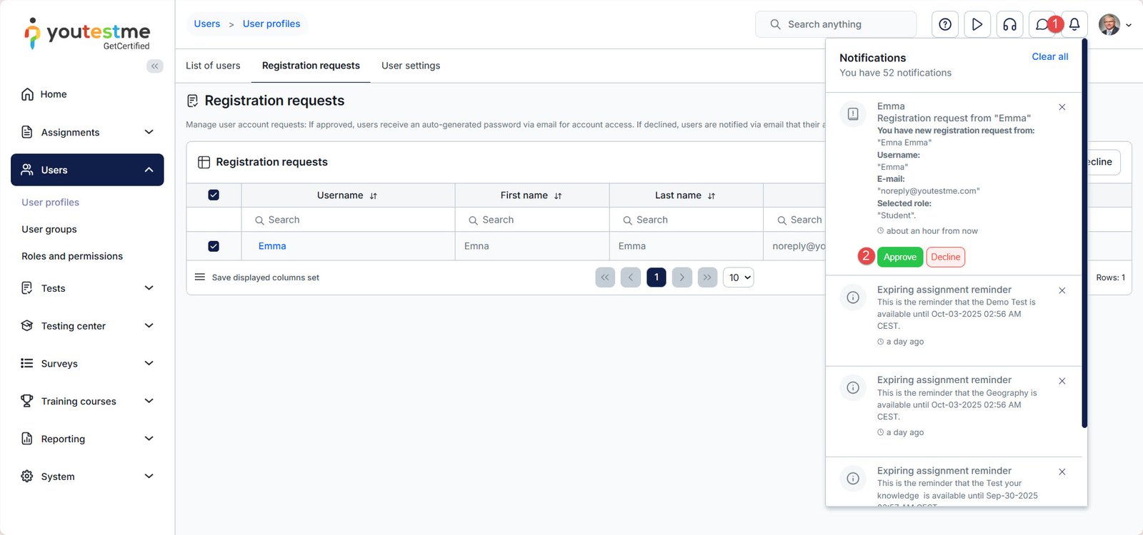 - Approve or decline the newly received registration request.