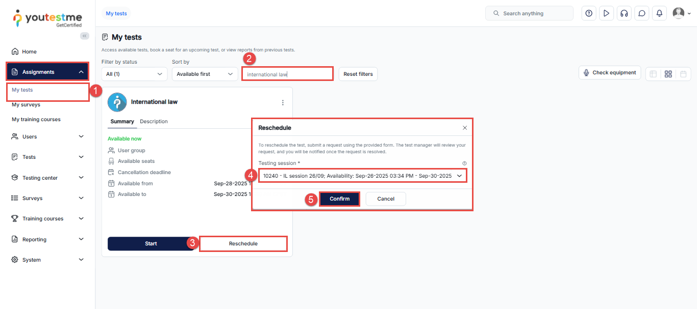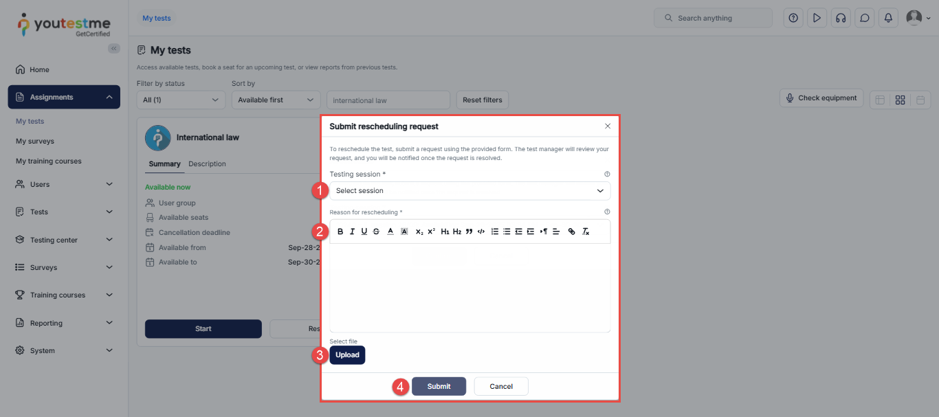 This article outlines the steps for students to reschedule their sessions on the YouTestMe platform successfully. Whether due to unavailability or a scheduling conflict, this article provides a clear example of how to reschedule a session with the limitation of only one free attempt and the steps needed to make subsequent rescheduling requests. Check this article for more information on how to book the exam session – purchase, cancel, or reschedule a testing session.