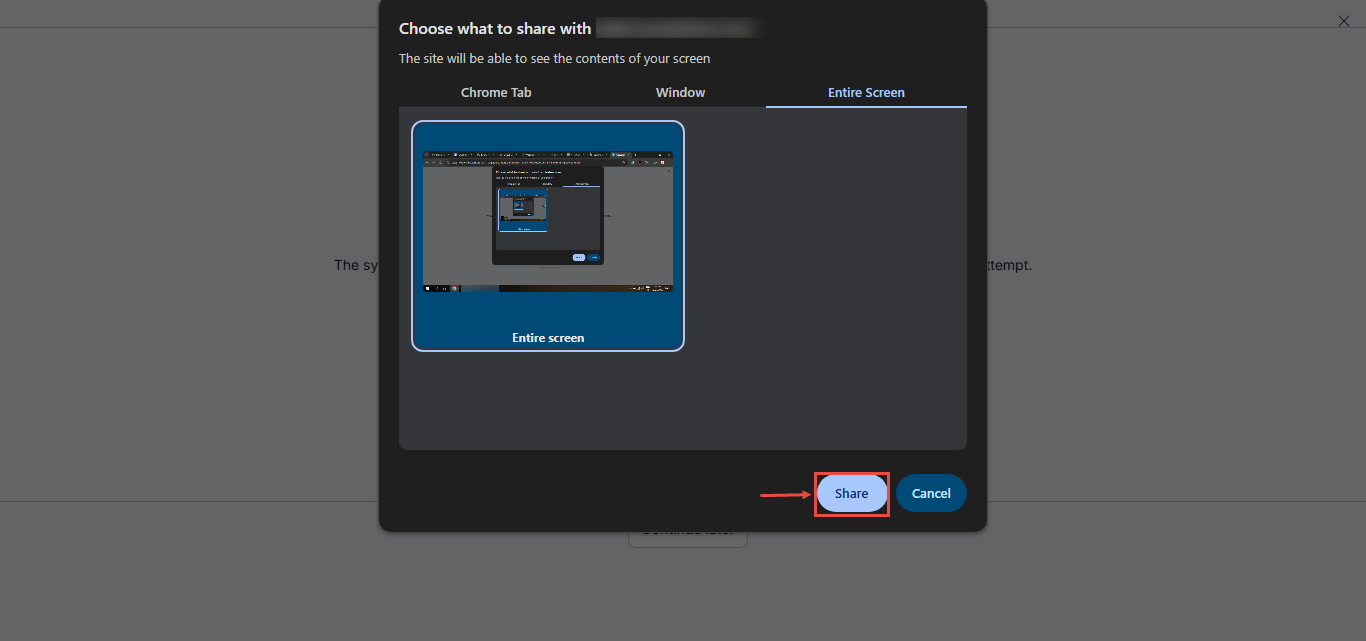 - In the screen-sharing step of the equipment check, the candidate will be asked to share their entire screen by selecting Entire screen and then clicking Share.