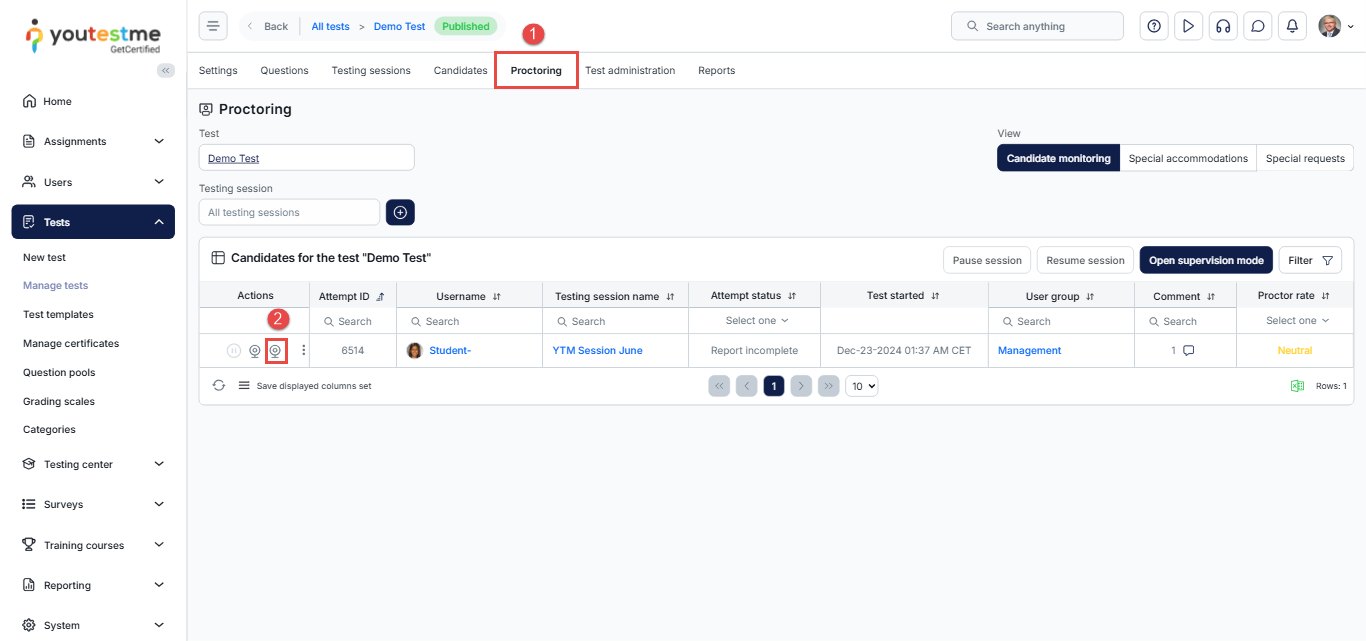 - Navigate to the Proctoring tab of the desired test.