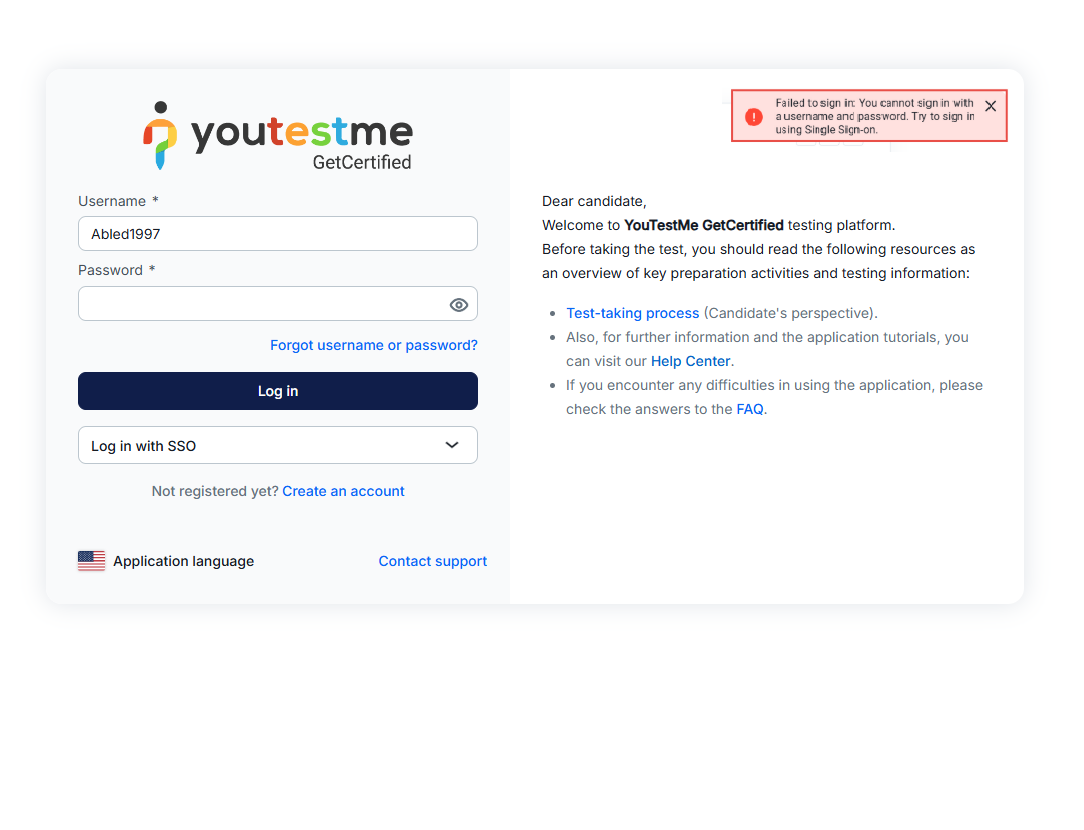 Failed to sign in: You cannot sign in with a username and password. Try to sign in using Single Sign-On.