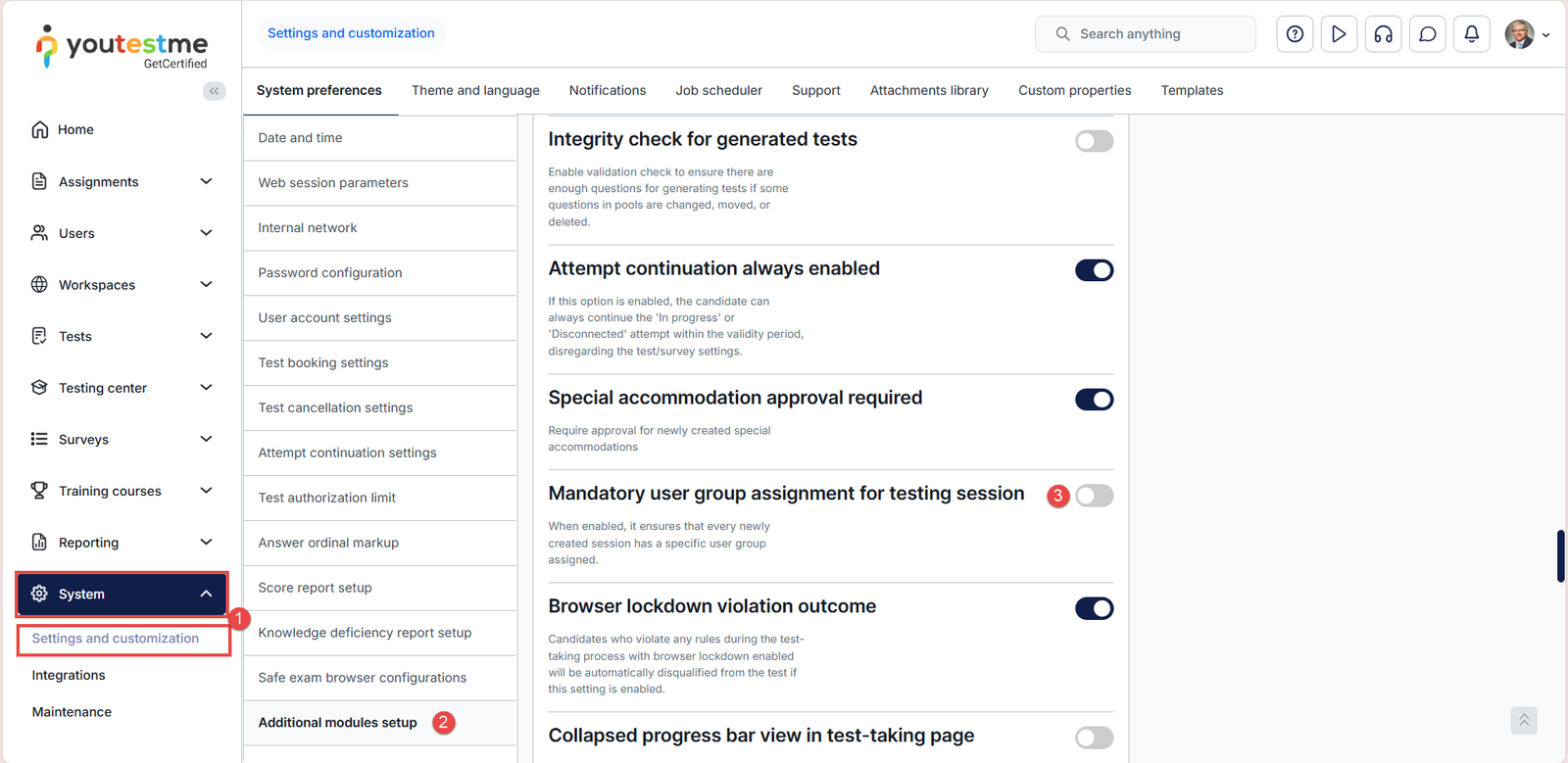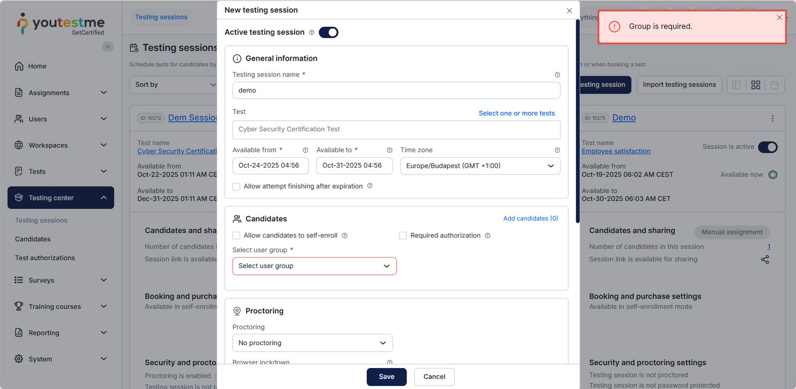 When this option is enabled, users cannot create or save a testing session without selecting a user group, helping organizations keep sessions organized, properly targeted, and compliant with internal rules.