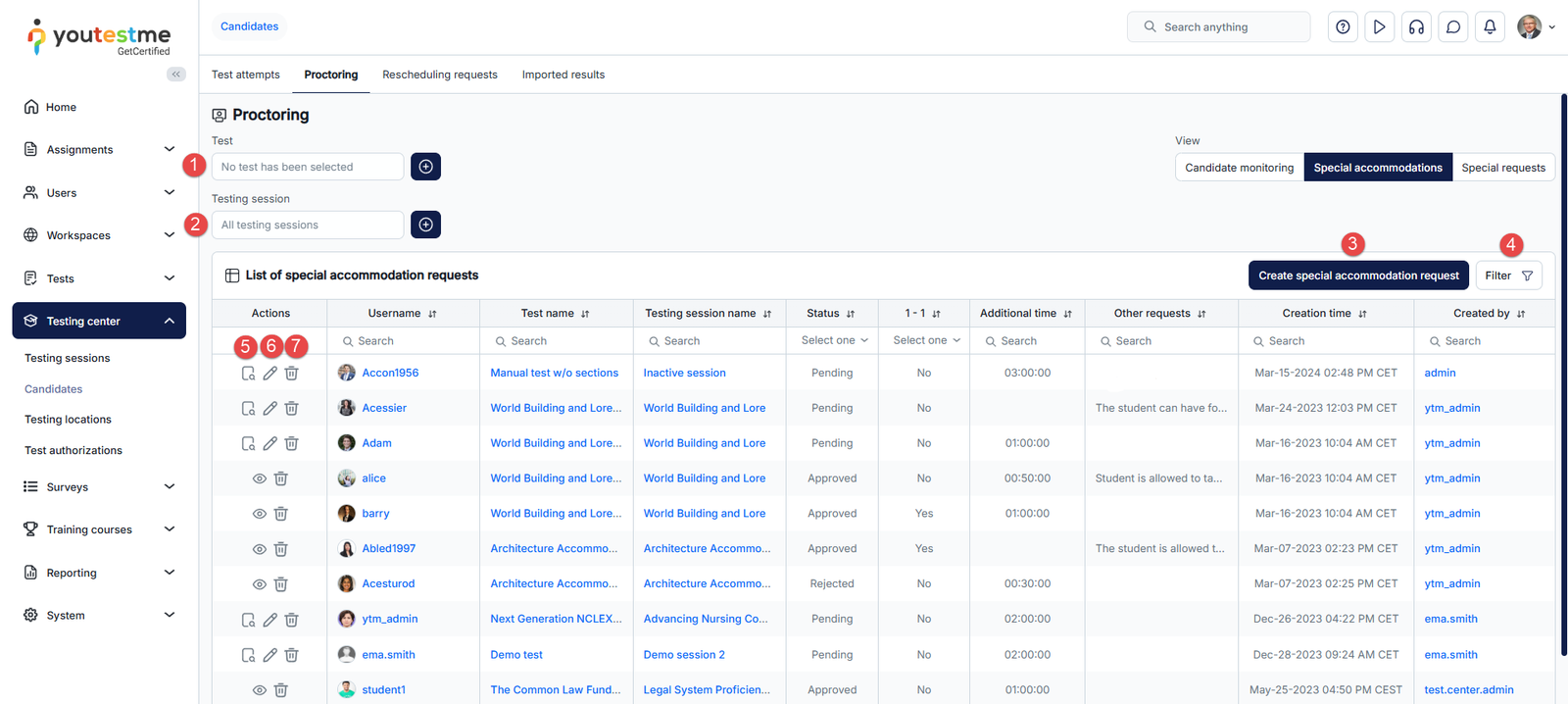- Select the testing session for which you want to see special requests. Click the plus icon to change the testing session, and you can remove filters as needed.