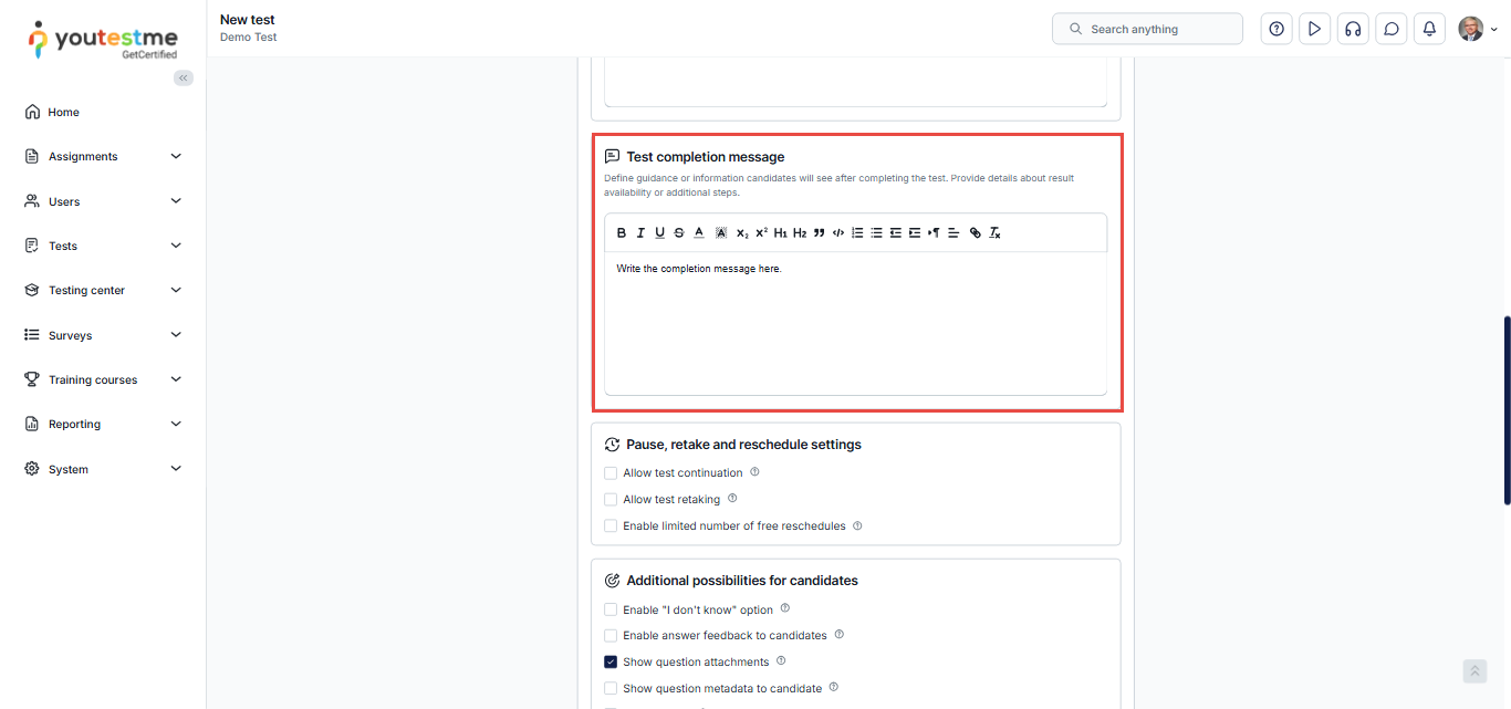 - Enter your desired message in the Test Completion Message field.